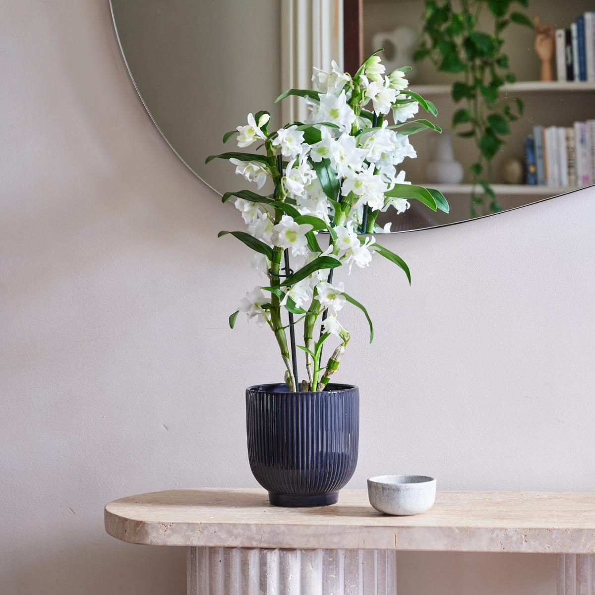 * Light: Enjoys bright, indirect light* Water: Likes its soil to be kept moist* Expert level: I'm perfect for those new to plant parenthood* Pet friendly: Safe for furry friends and little people* Air purifying: I remove the nasties lurking in your room This tall, elegant houseplant is a true beauty. The Bamboo Orchid features the delicate, well-loved flowers of the orchid as well as the tall, thin stems of the bamboo plant. What’s not to love? A striking houseplant, which will look beautiful in any space, the Bamboo Orchid loves plenty of bright, indirect light. But be careful of any direct sunlight, which can burn its beautiful leaves. We recommend rotating your plant regularly to achieve full, even growth. Paired with our perfectly fitting ribbed ceramic pot. * How to keep me happy:* Light: Enjoys bright, indirect light and can even cope with some direct sunlight. * Water: Let your plant dry out before watering. * Expert level: I'm perfect for those new to plant parenthood Please note:As this is a living product your plant may vary to the one photographed. Plant height measurement includes the pot. Width measurement is for the width of the pot only; width of the plant may vary.