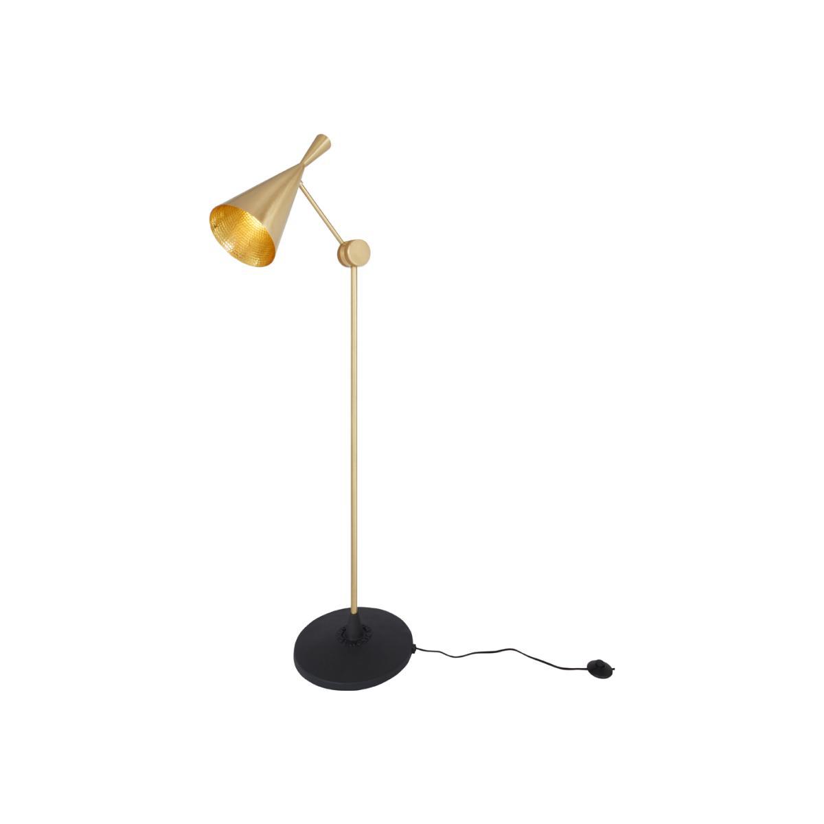 The sculptural Beat collection by Tom Dixon showcases expressive minimalism, a beautiful synthesis of careful craftsmanship and contemporary design. With its signature streamline silhouette, this striking brass Beat Floor Lamp is instantly recognisable, inspired by traditional water vessels crafted in India and mounted on an adjustable arm for a direct beam. Featuring a glistening brass shade lining, the reflective inner panel is spun, braised and hammered by hand for a unique, textural finish and finished with solid brass and an iron sand cast base. Founded in 2002 by Tom Dixon, the eponymous brand specialises in the revival of the British furniture industry, working with beautiful raw materials and streamline silhouettes to create contemporary pieces. Perfect as a single eye-catching lighting solution for a living room, workspace or bedroom, the brass Beat Floor Lamp is a creative and distinctive way to illuminate your space. Requires: 1 x Max 42W E14 bulb