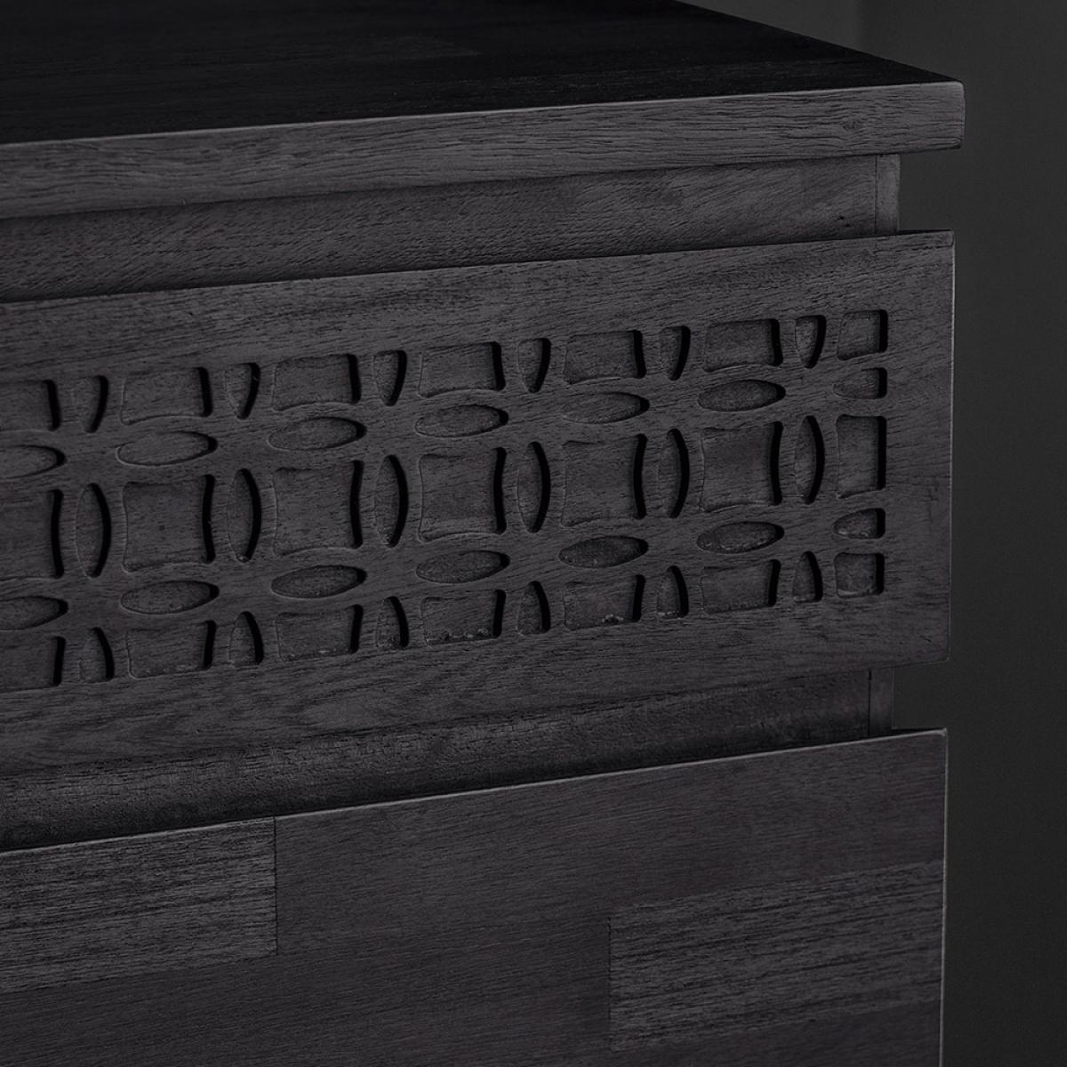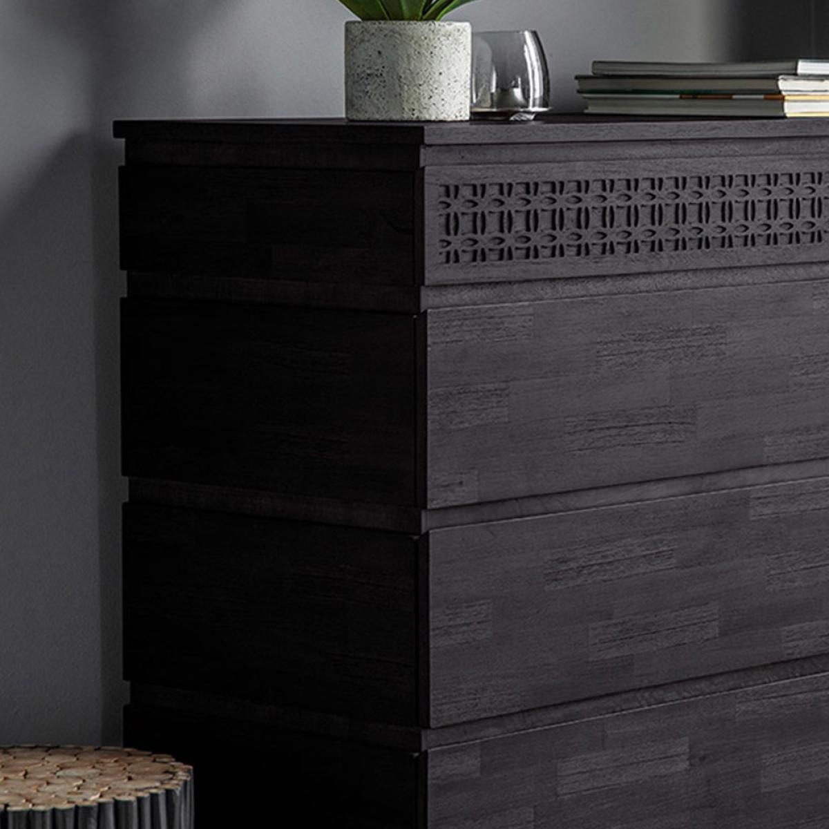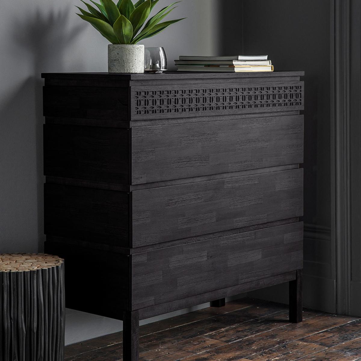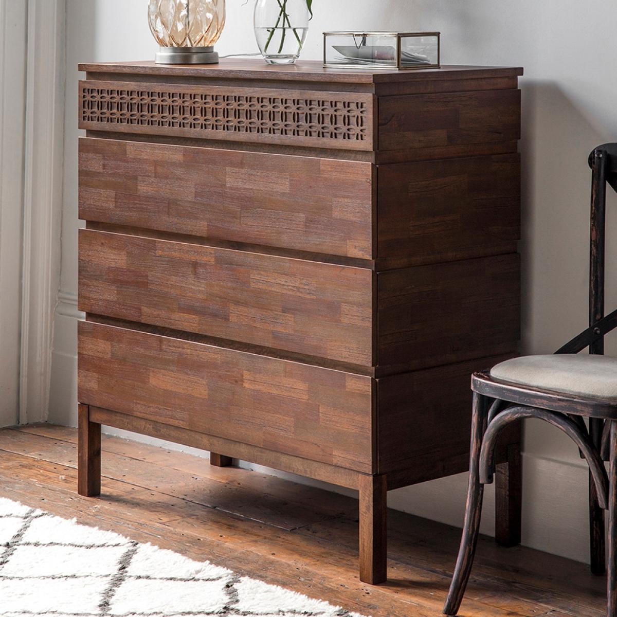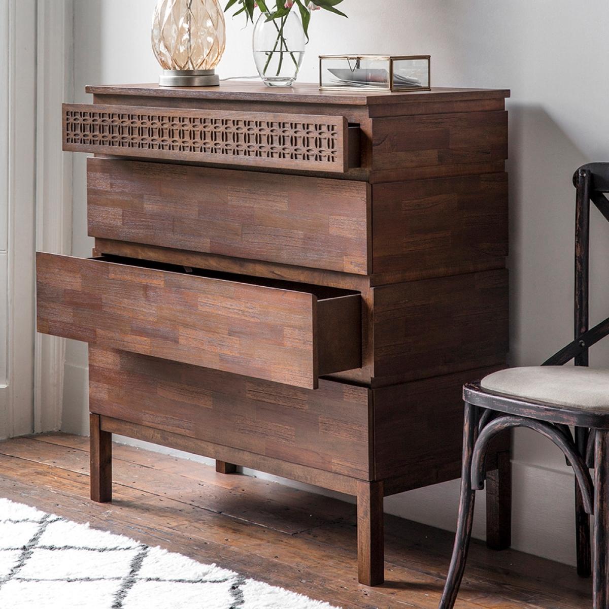 With a wonderfully distinctive and functional style, the Beatnik Chest Of Drawerstakes it's inspiration from free. Spirited. Bohemian roots. Made from Mango wood and mixed timber veneers, the on trend finish allows the natural grains of the wood to. Subtly. Come through. The. Signature. Patterned fret detail can also be seen at the top of the drawers, finishing off this beautifully crafted piece of furniture. Partner with the four poster Beatnik Bed to create your perfect boho boudoir!.
