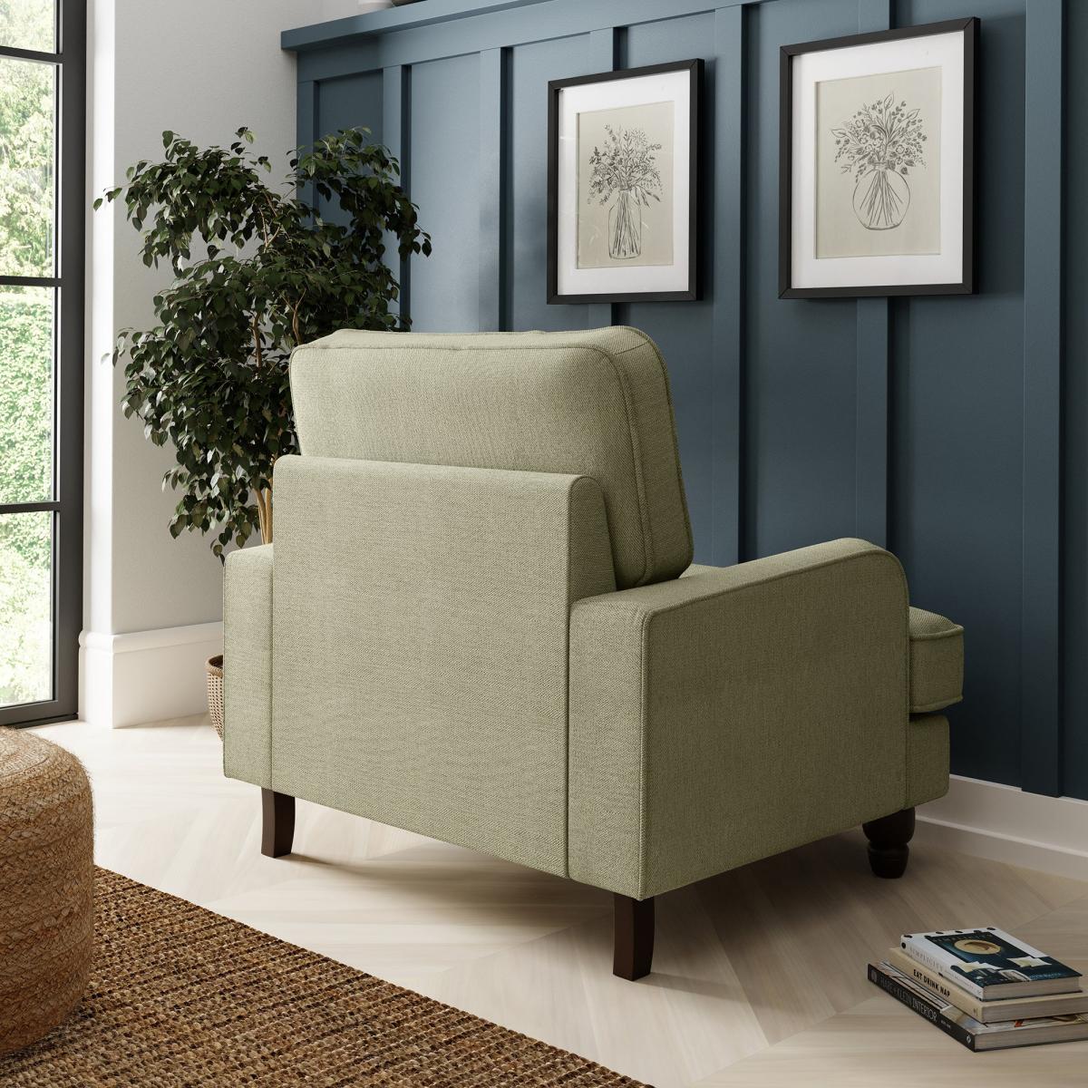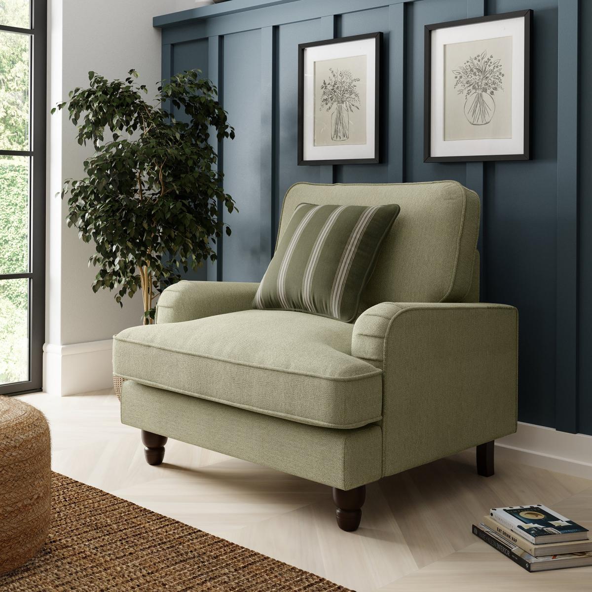 I love this armchair for its versatile, calm tone and its classic yet contemporary silhouette. The green tonal chenille fabric is especially practical, offering durability and texture that works well in both traditional and modern schemes. It pairs beautifully with neutral palettes, but can also serve as a subtle statement piece in a more colourful room. For styling tips, try accenting it with patterned cushions or a textured throw to add visual interest. It’s equally suited to living rooms, bedrooms, or reading nooks, especially when mixed with wooden or other natural materials to enhance its relaxed, inviting vibe.