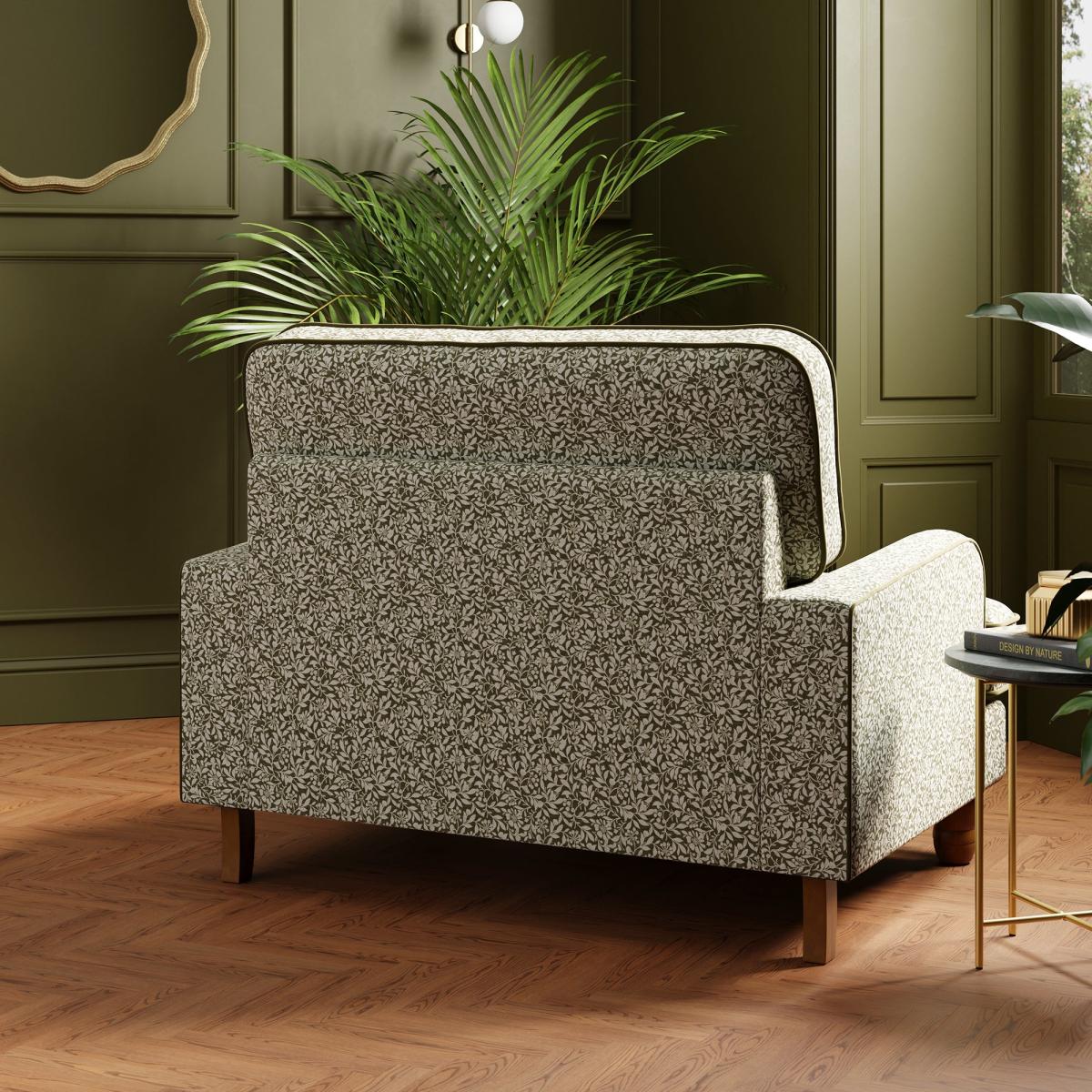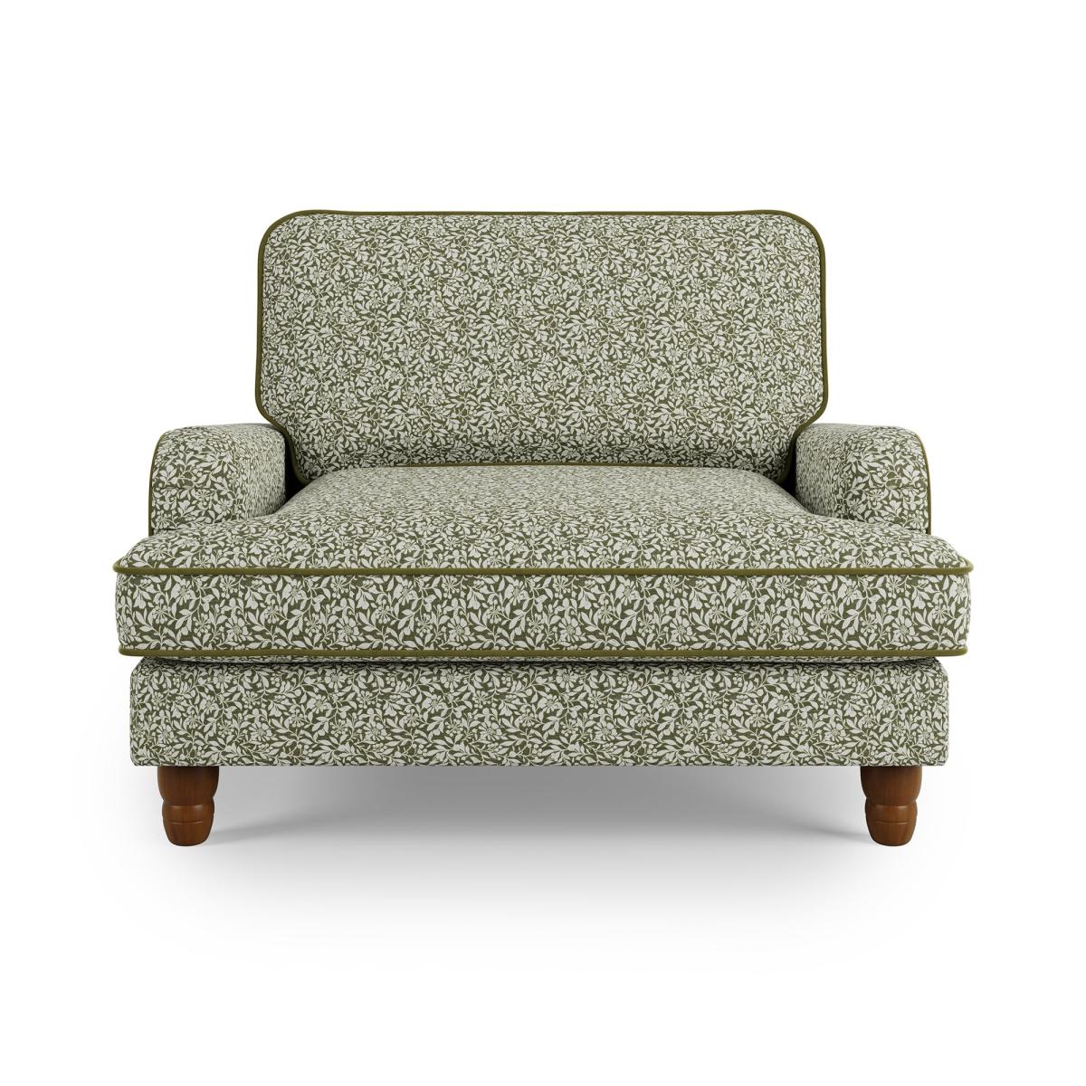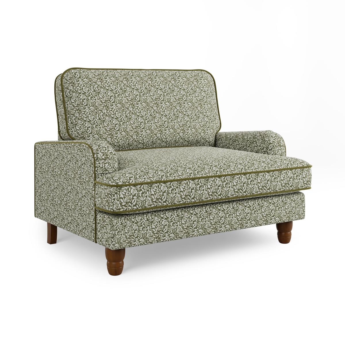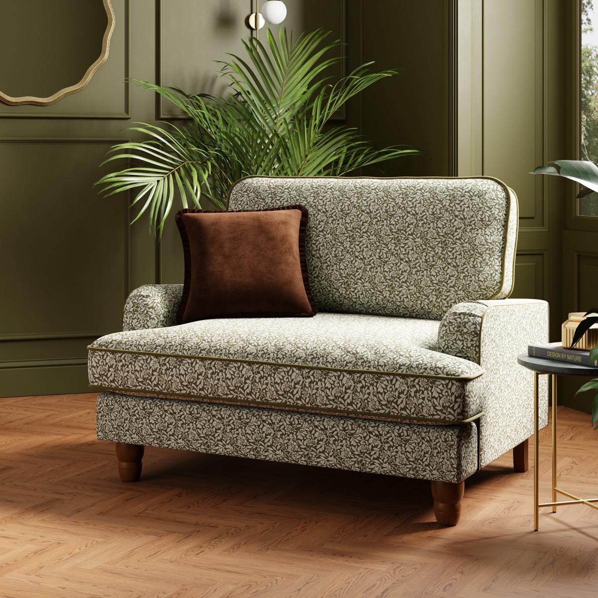 Dunelm Exclusive - Designed and Developed by Dunelm * Snuggle chair for cosy and intimate seating * Fixed back for support * Square arms for a contemporary look * Foam and fibre filled cushions for a comfortable experience This Beatrice snuggle chair combines comfort and elegance in a generously proportioned design, perfect for curling up and relaxing. Upholstered in a luxurious fabric with a charming leaf pattern, this chair adds a touch of sophistication and character to any living space. Its deep, cushioned seat and soft, supportive backrest make it an inviting spot to unwind, while the sturdy frame ensures long-lasting durability.