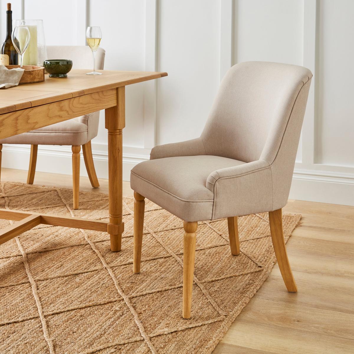 I often specify the Beatrice chair in my schemes because its softly curved back and solid oak legs strike a balance between comfort and clean lines. The neutral fabric works equally well in Scandi-inspired dining rooms or more traditional, panelled spaces, and the generous cushioning means guests stay comfy long after the plates are cleared. For styling, team these chairs with a simple, light-wood table and natural-fibre rug to emphasise a relaxed, airy feel. If you prefer contrast, add a dark metal pendant lamp overhead and a slimline sideboard in charcoal or deep green. A subtle linen seat pad or a small velvet cushion can introduce pattern without overwhelming the look.