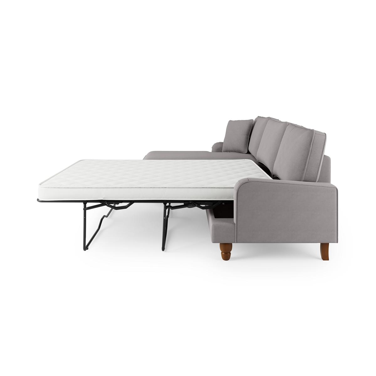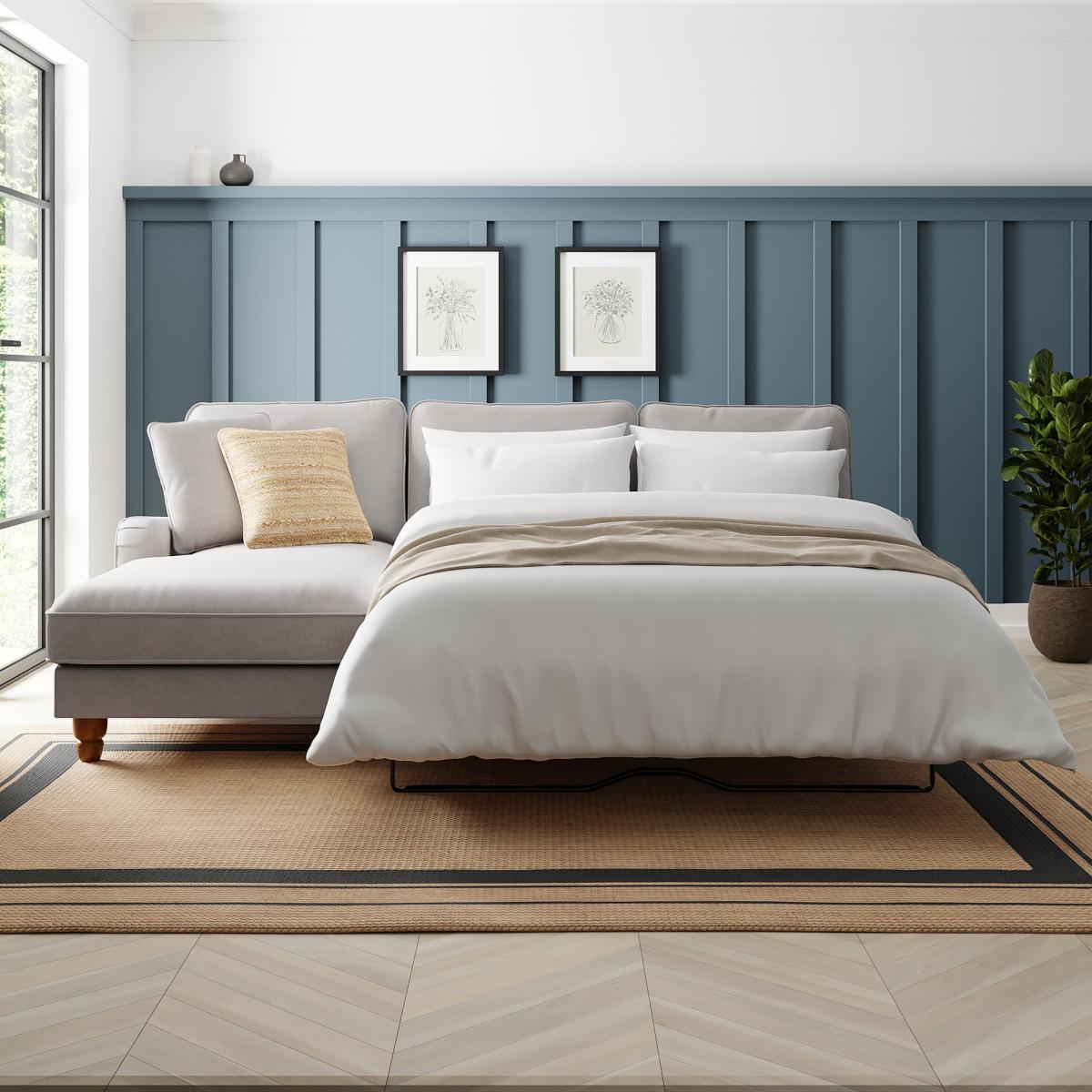 Dunelm Exclusive - Designed and Developed by Dunelm* Soft flatweave upholstery* Piped edge detailing* Removeable sofa cushions* Folds out to a double bed Upholstered in durable flatweave fabric, this corner sofa bed offers both comfort and functionality. With its sleek design and neutral color palette, it seamlessly complements a variety of interior styles. The corner configuration maximises seating space, making it perfect for lounging or accommodating overnight guests. Plus, the integrated storage compartment beneath the chaise provides a convenient solution for tidying away blankets, pillows, or other essentials. Featuring foam-filled seats, fiber-filled back cushions, and sturdy wooden legs, the Beatrice sofa bed offers optimal comfort and support for everyday use.