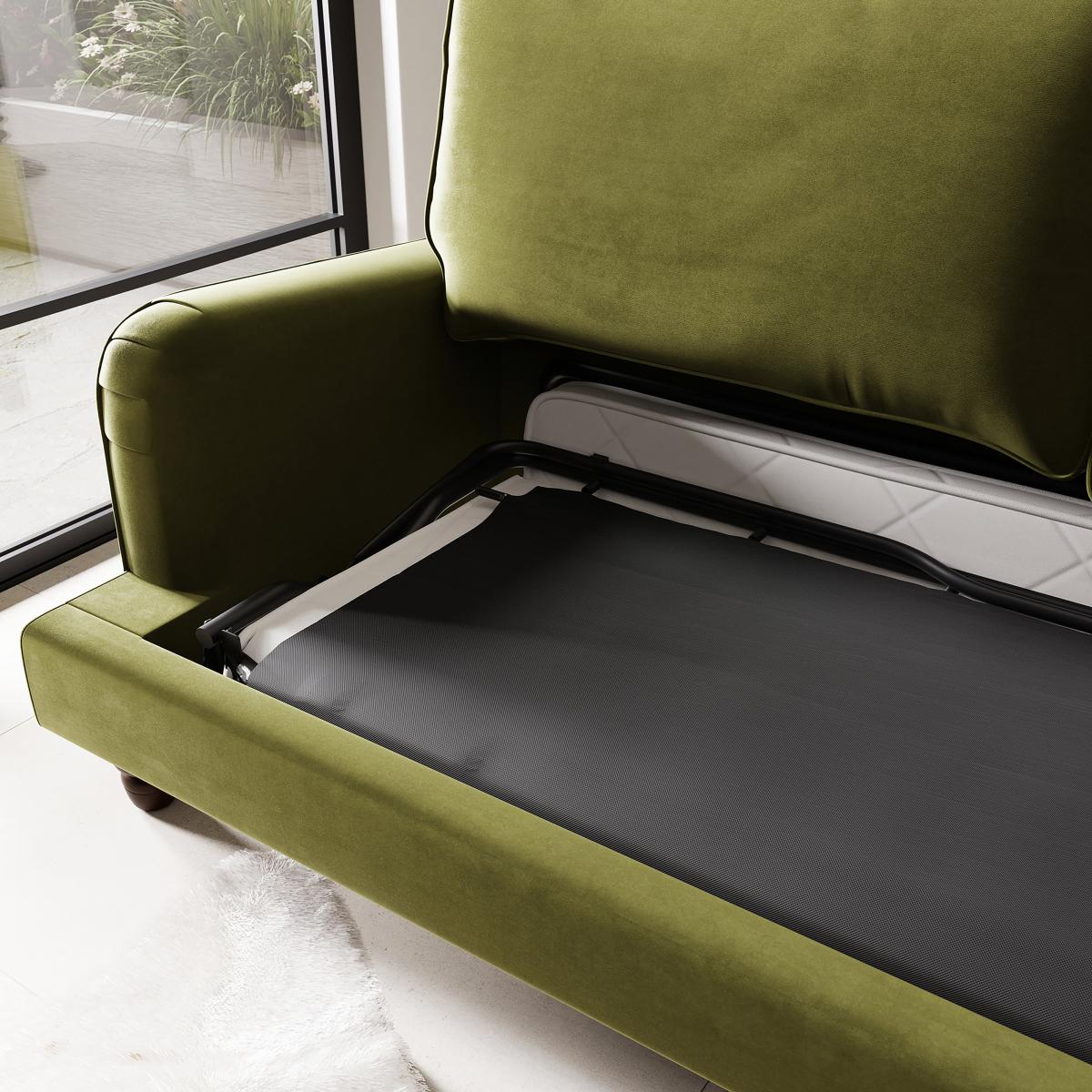 Dunelm Exclusive - Designed and Developed by Dunelm Offering a modern take on a vintage style, the Beatrice sofa bed would make a magnificent addition to any home. This sofa is upholstered in a 100% recycled velvet fabric that's both luxuriously soft and kind to the environment, made using a total of 143 recycled plastic bottles. Complete with a pleated arm design, piped edge detailing and turned, natural finished rubberwood legs, this sofa offers a stunning design that would bring a touch of sophistication and elegance to any room. As well as being undoubtedly stylish, the Beatrice is comfortable too, offering foam and fibre filled seats and a webbed and sprung base to provide optimal support, as well as plush fibre-filled back cushions and two matching scatter cushions. This sofa is also great for when you have guests over, easily converting into a double bed, complete with a 10cm deep coil spring and foam mattress. The bi-fold flip sofa bed mechanism also features a locking TV headrest function to provide added comfort when lounging or watching TV, and an anti-tilt system. Made with recycled materials. Need to throw out your old sofa first? View our information on [furniture recycling and collections](https://www. dunelm. com/info/about/mattress-and-furniture-recycling).