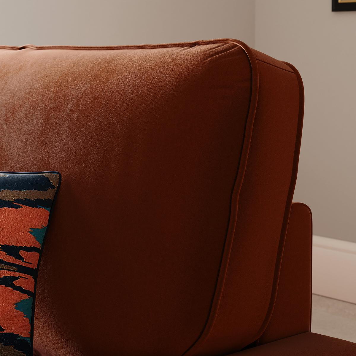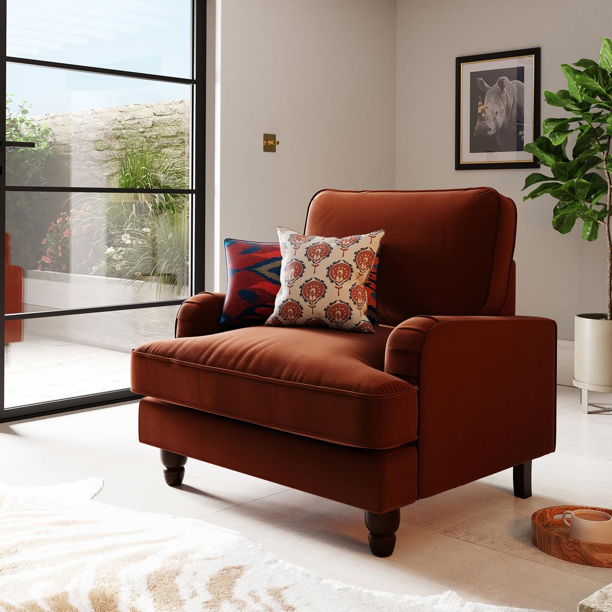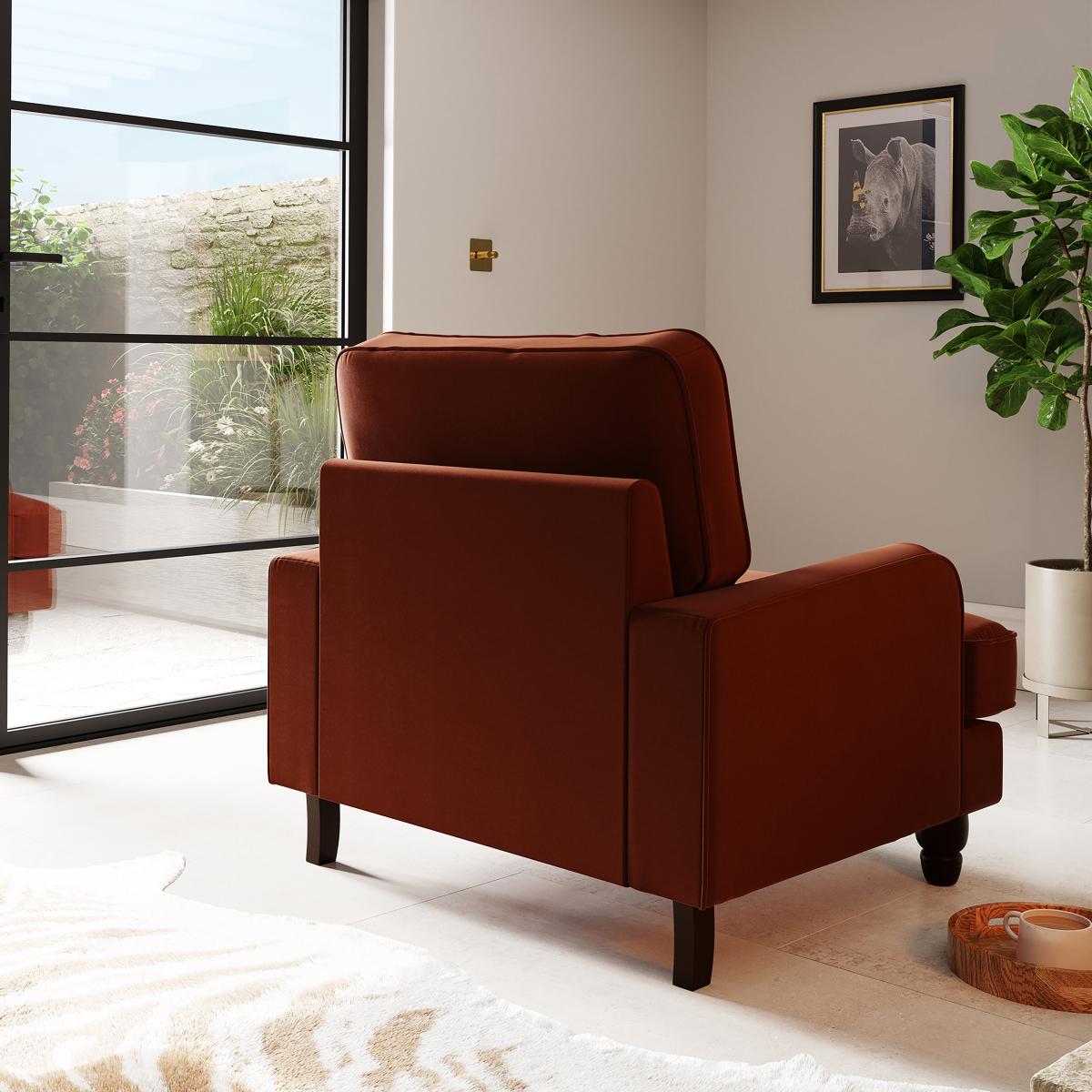 I love this armchair because of its rich matte velvet finish and warm orange umber tone, which makes it a versatile statement piece. It works particularly well in eclectic, bohemian, or mid-century modern interiors, where its cosy yet stylish vibe can really shine. For styling tips, pair it with textured cushions or layered throws to add depth, and consider placing it near natural light to enhance the velvet's subtle sheen. It’s also a practical choice for creating a welcoming reading nook or accent seating in living rooms, thanks to its inviting colour and maintenance-friendly fabric.