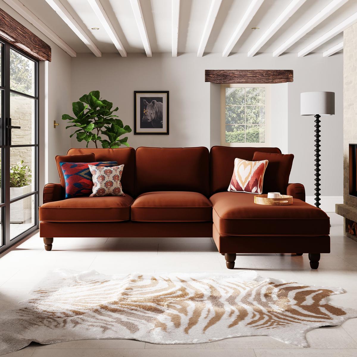 Offering a modern take on a vintage style, the Beatrice corner sofa would make a magnificent addition to any home. This sofa is upholstered in a 100% recycled velvet fabric that's both luxuriously soft and kind to the environment, made using a recycled plastic bottles. Complete with a pleated arm design, piped edge detailing and turned, natural finished rubberwood legs, this sofa offers a stunning design that would bring a touch of sophistication and elegance to any room. As well as being undoubtedly stylish, the Beatrice is comfortable too, offering foam and fibre filled seats and a webbed and sprung base to provide optimal support, as well as plush fibre filled back cushions and two matching scatter cushions. Made with recycled materials. To check out our handy sizing guide to help you find out if you’ll be able to get your new furniture into your home. Need to throw out your old sofa first? View our information on. Furniture recycling and collections.