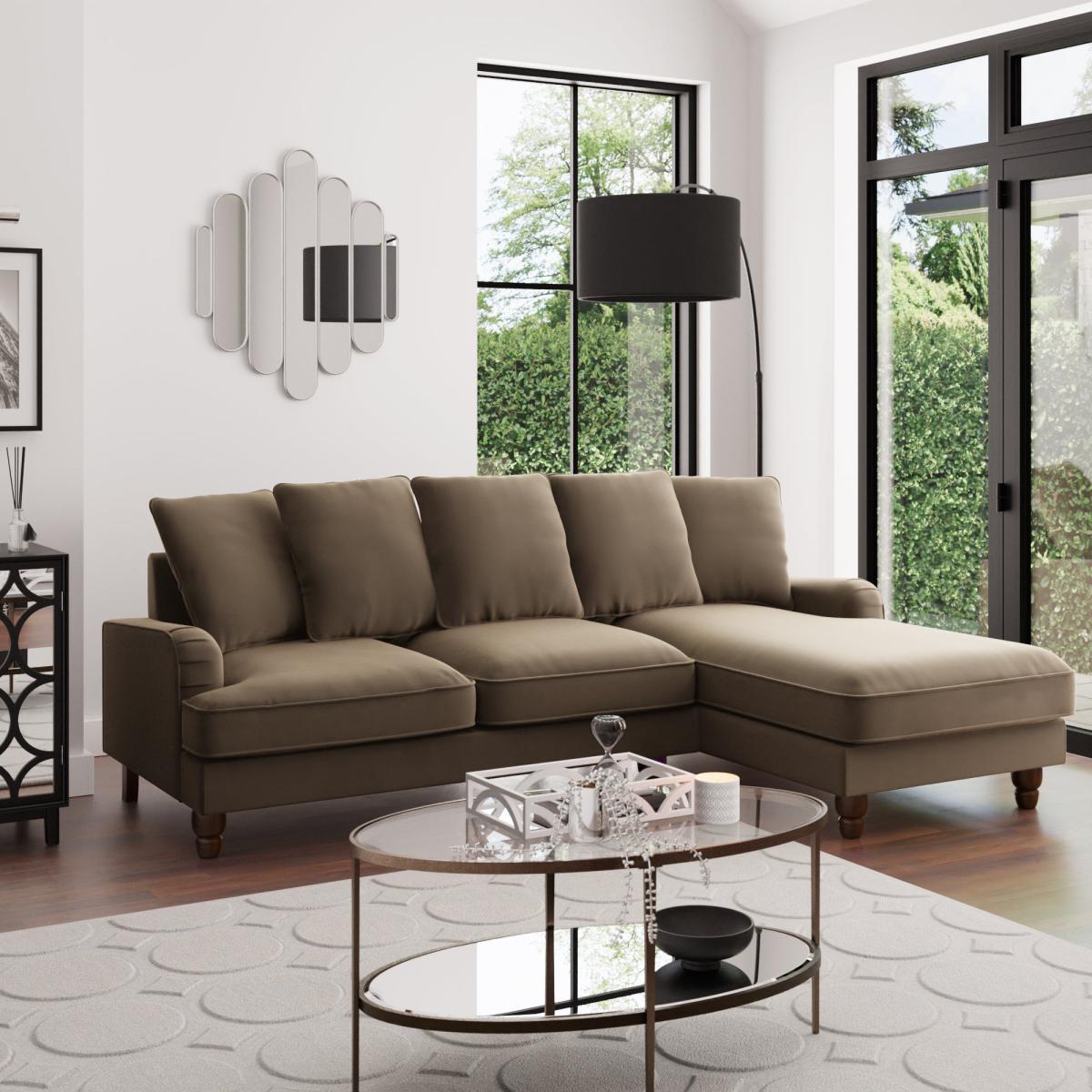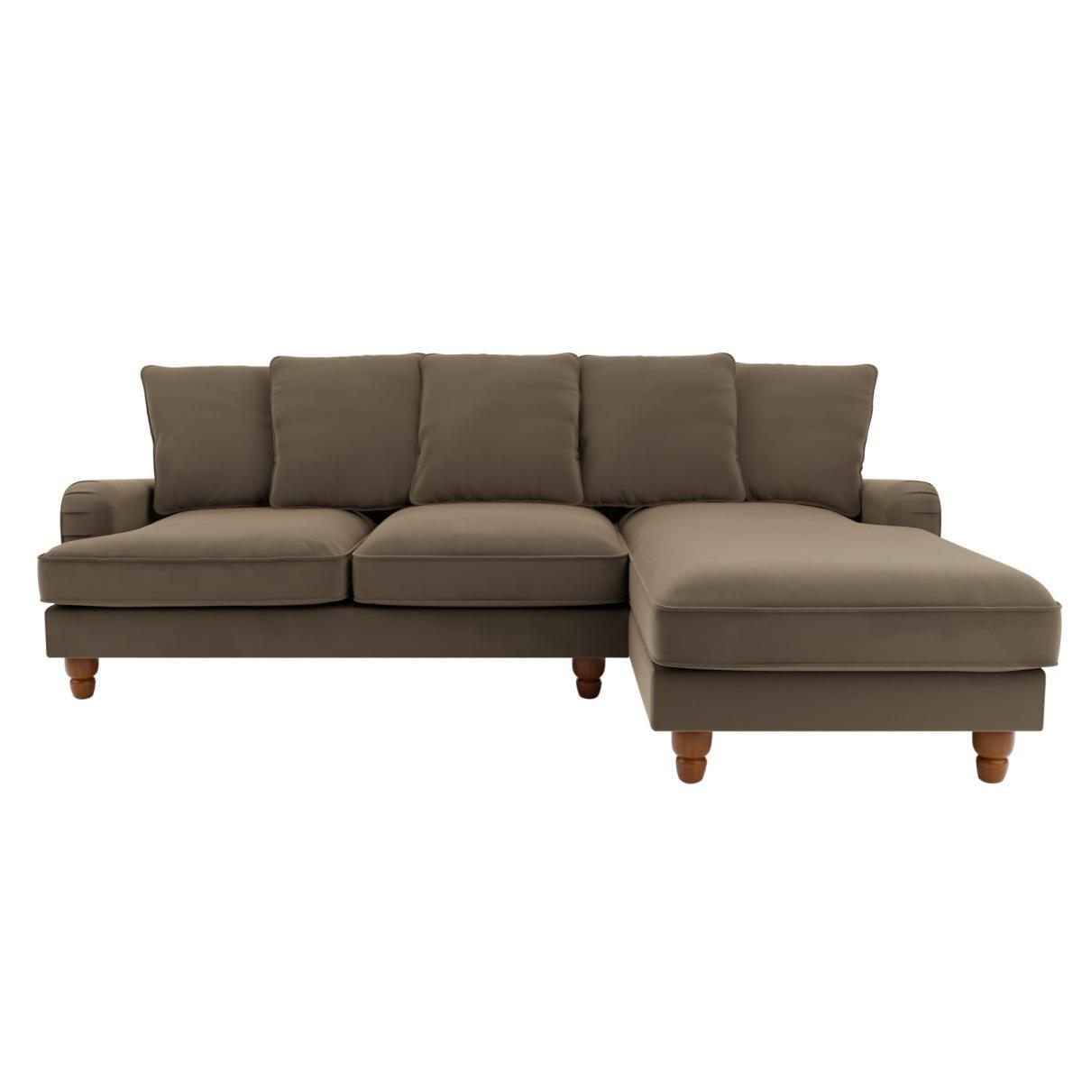 Offering a modern take on a vintage style, the Beatrice corner sofa would make a magnificent addition to any home. This sofa is upholstered in a 100% recycled velvet fabric that's both luxuriously soft and kind to the environment, made using a recycled plastic bottles. Complete with a pleated arm design, piped edge detailing and turned, natural finished rubberwood legs, this sofa offers a stunning design that would bring a touch of sophistication and elegance to any room. As well as being undoubtedly stylish, the Beatrice is comfortable too, offering foam and fibre filled seats and a webbed and sprung base to provide optimal support, as well as six plush fibre-filled scatter cushions. Made with recycled materials. To check out our handy sizing guide to help you find out if you’ll be able to get your new furniture into your home.