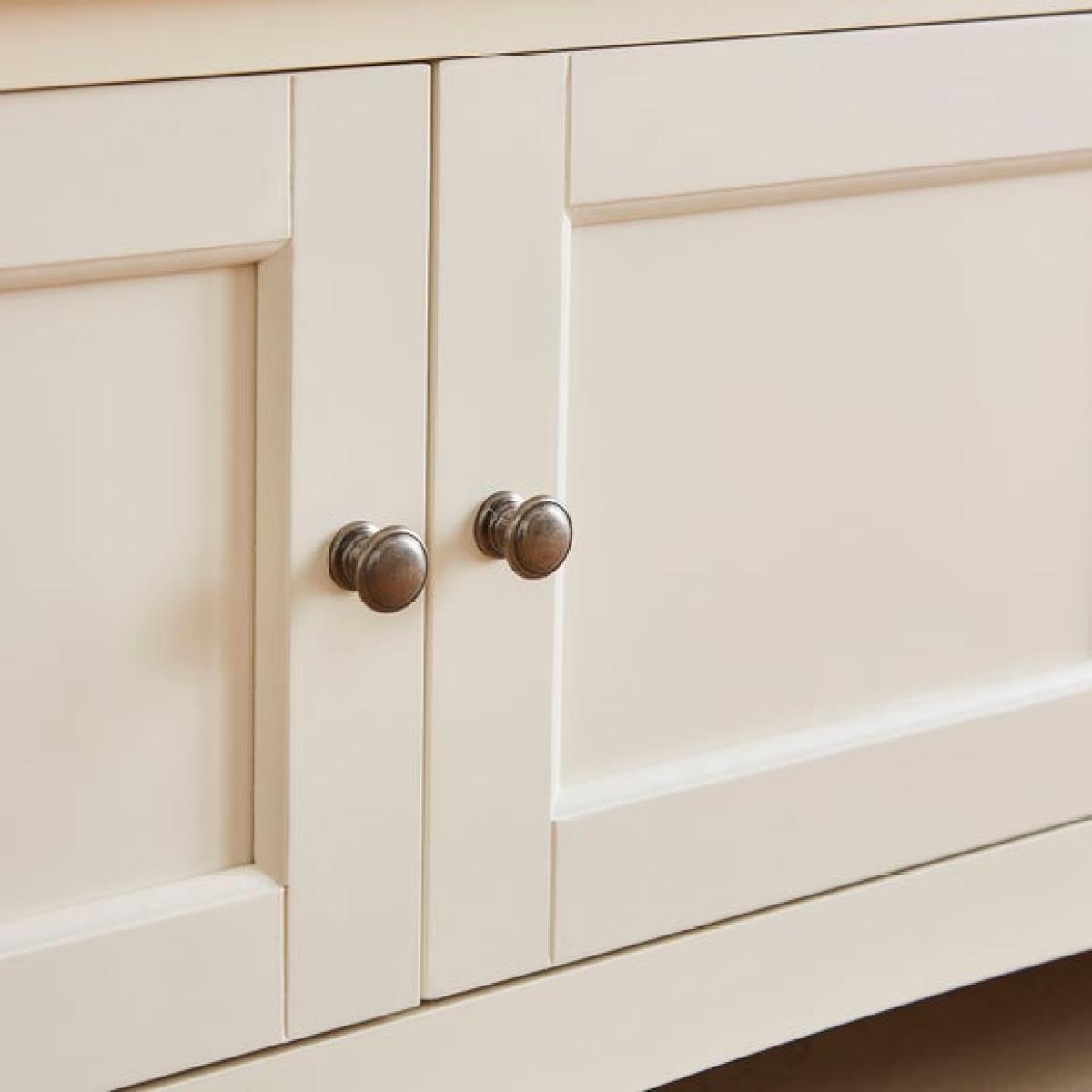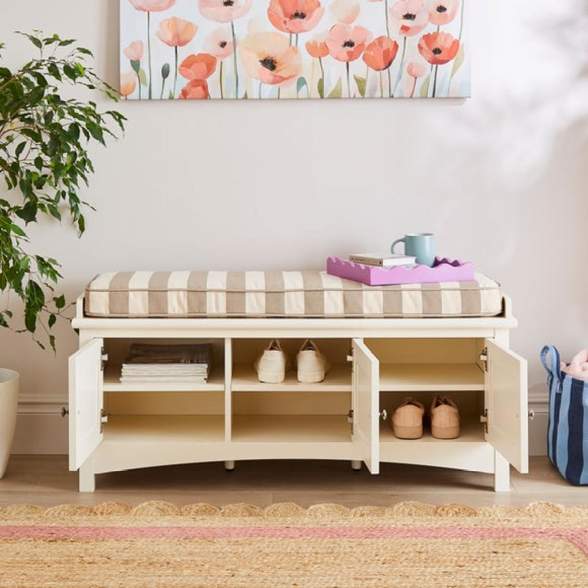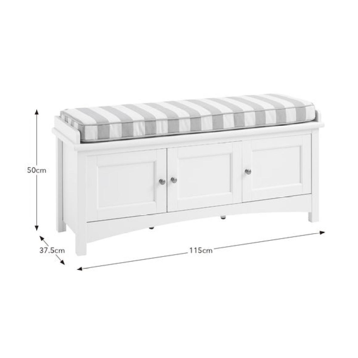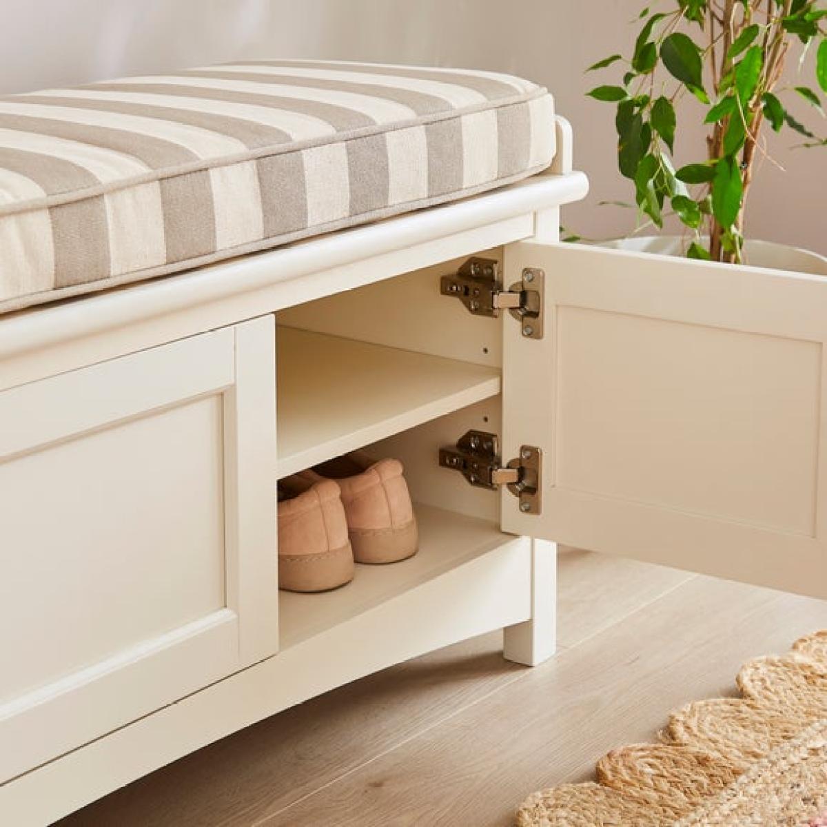* Painted finish * Upholstered foam filled cushion * Striped fabric * Adjustable, removable shelves * 3 soft-closing doors with metal handles * Space saving storage Part of our Beatrice range, this useful Storage Bench features an upholstered, foam filled cushion in a gorgeous green striped fabric sitting on a durable wooden bench. Keep everything neat and tidy with ease - the three soft-close doors open to reveal adjustable, removable shelves for useful, flexible storage of shoes or other hallway paraphernalia. The painted finish is an attractive shade of green - perfect for farmhouse or country style interiors.