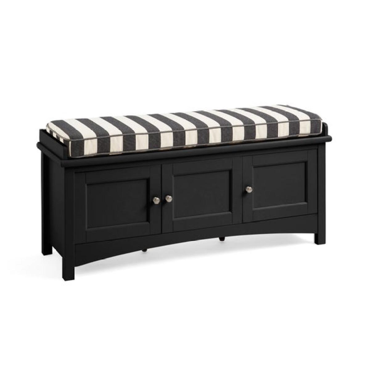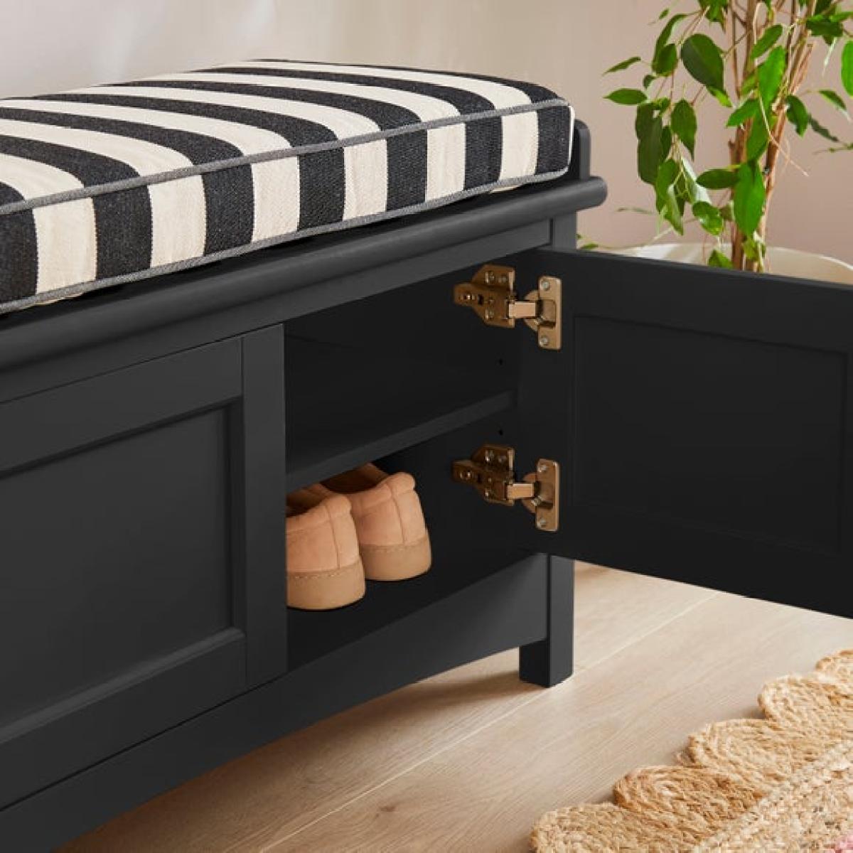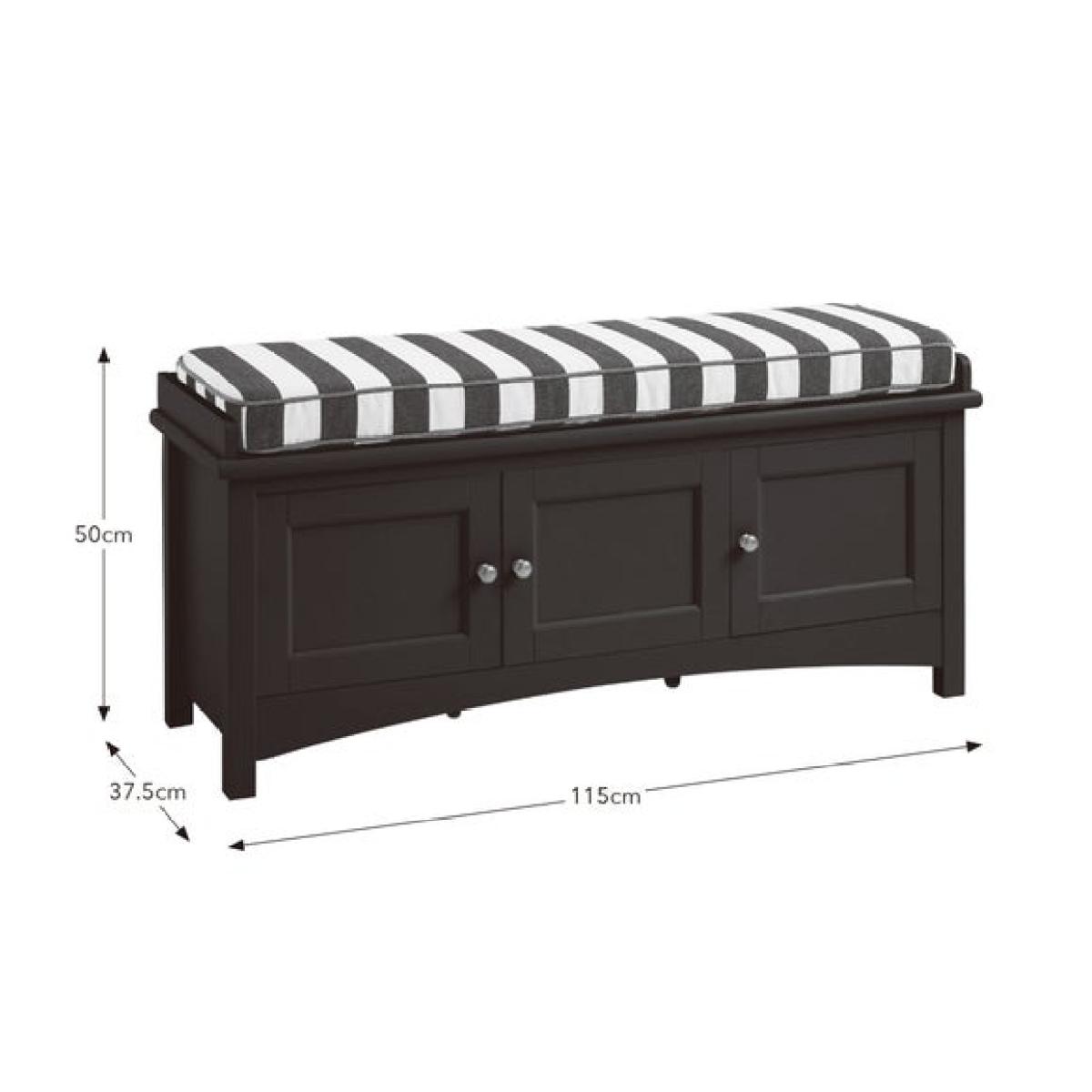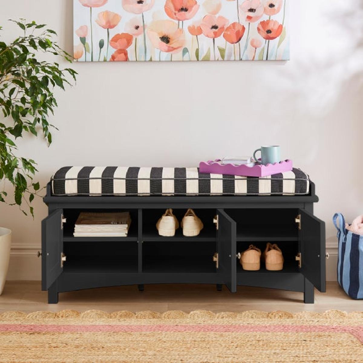 * Painted finish * Upholstered foam filled cushion * Striped fabric * Adjustable, removable shelves * 3 soft-closing doors with metal handles * Space saving storage Part of our Beatrice range, this useful Storage Bench features an upholstered, foam filled cushion in a gorgeous green striped fabric sitting on a durable wooden bench. Keep everything neat and tidy with ease - the three soft-close doors open to reveal adjustable, removable shelves for useful, flexible storage of shoes or other hallway paraphernalia. The painted finish is an attractive shade of green - perfect for farmhouse or country style interiors.