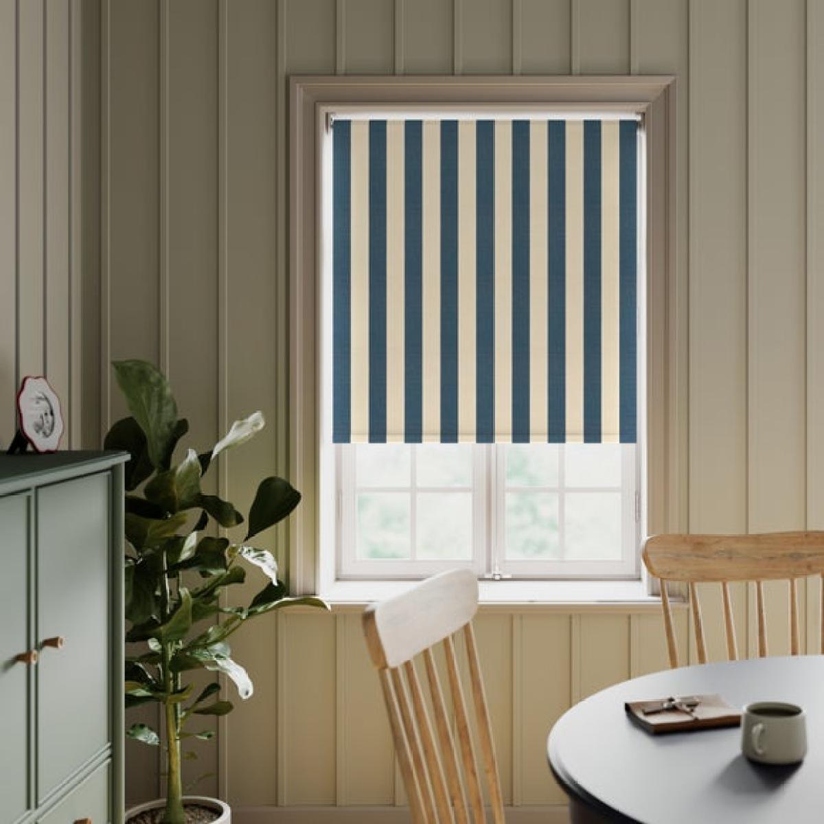 * Beatrice striped design, navy stripe on natural background * Blackout * Fire Retardant * 100% recycled polyester * Coordinating upholstered items available to purchase separately * Pick a side for the operating chain * Supplied with all fixings for simple installation Simple yet striking, the Beatrice Stripe Fire Retardant Blackout roller blind adds a modern, charming, and elegant touch to your space. It features a navy stripe on a natural background. Crafted from 100% recycled polyester, the fabric is fire retardant and blackout lined to offer practicality, privacy, and reduce natural light. Tailored to your made-to-measure requirements, the blind is supplied with all the fixings for easy installation. Complete the look by pairing with coordinating upholstered items in this design. Create a practical, inviting, and stylish ambience with the Beatrice Striped Fire Retardant Blackout roller blind.