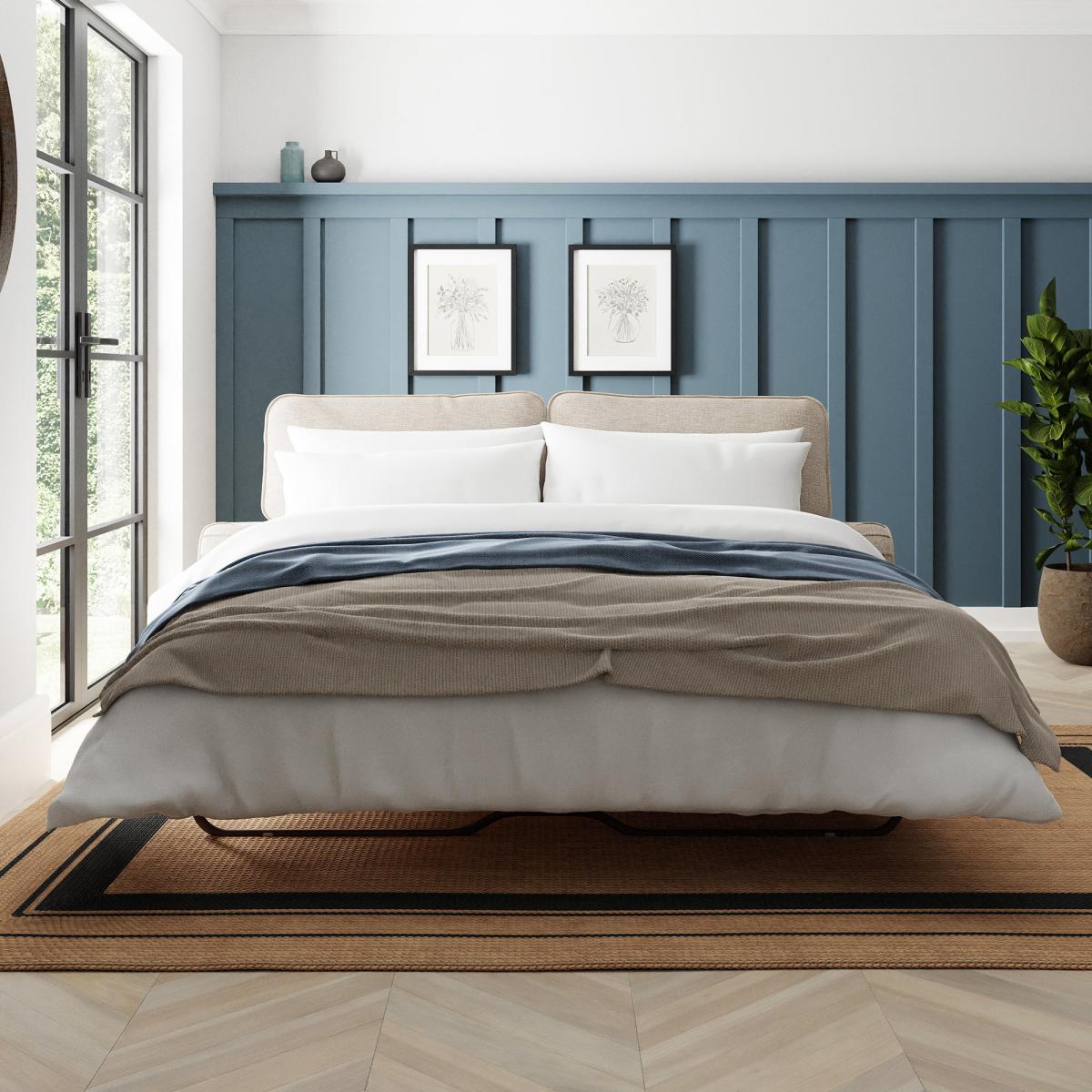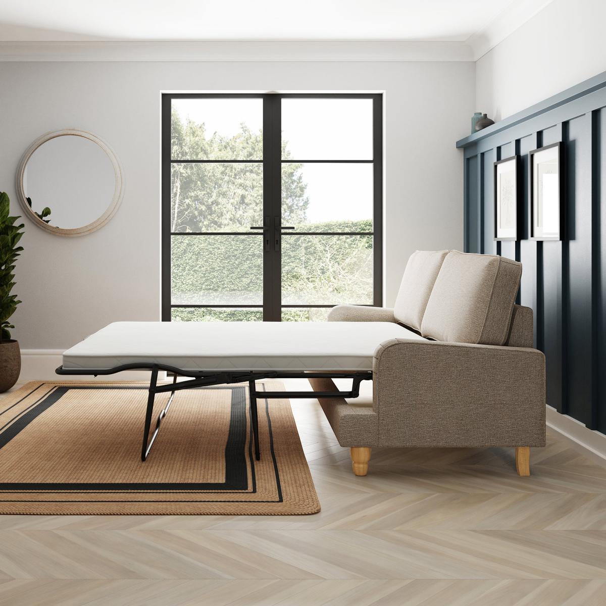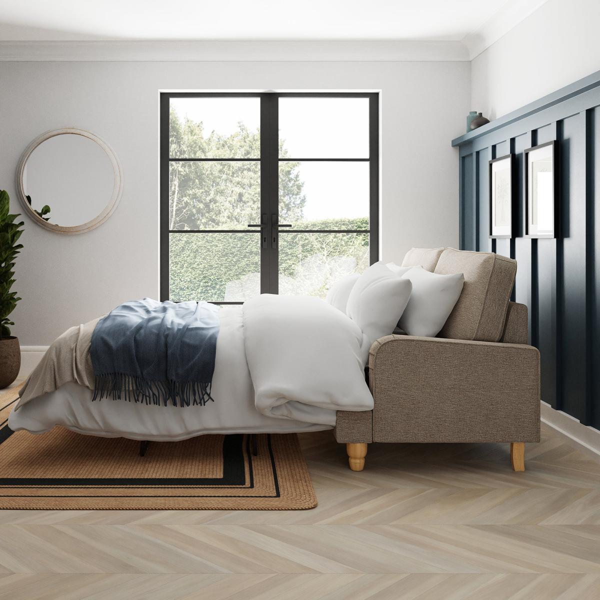 The Beatrice tonally textured weave sofa bed is a versatile piece that works well in both contemporary and neutral interiors. I love its subtle texture and linen fabric, which add visual interest without overpowering the space. It’s a practical choice for smaller rooms or multi-functional spaces, as it easily transforms from seating to a bed. For styling, consider pairing it with crisp, plain bedding to highlight the fabric’s texture or layered with cosy throws and cushions in complementary tones for a relaxed, inviting look. To keep the aesthetic fresh, place it against a backdrop of soft, neutral colours or muted pastels, and add minimal décor around so the sofa bed remains the focal point.