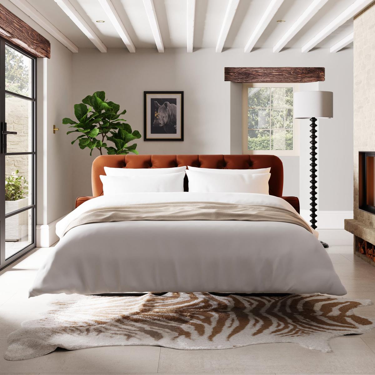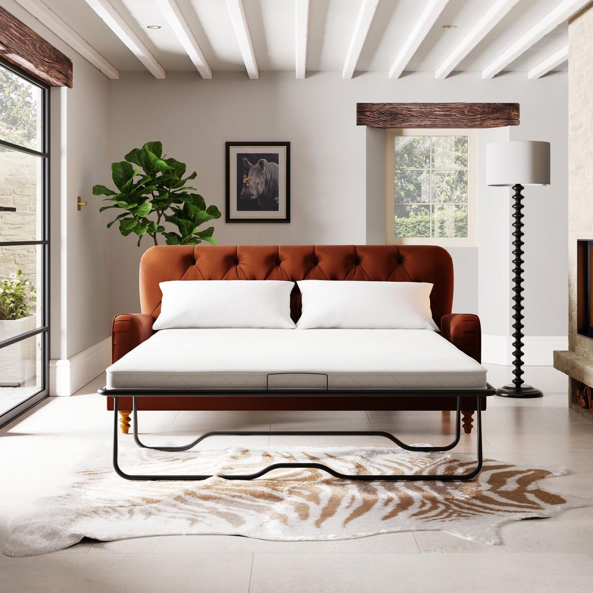 I love this sofa bed for its bold orange umber velvet, which makes it a statement piece, especially in contemporary or eclectic interiors. Its buttoned design lends a touch of sophistication, while the velvet finish adds warmth and richness to the space. It works well in smaller living areas where multifunctional furniture is key, acting as both a stylish sofa and a comfortable bed. To style around it, consider neutral or earth-toned accessories to let the sofa bed stand out, and keep the surroundings minimal for a chic, modern look. Practical tips include adding some cosy cushions and throws to enhance comfort and introducing a sleek side table or a scatter rug for added texture and functionality.