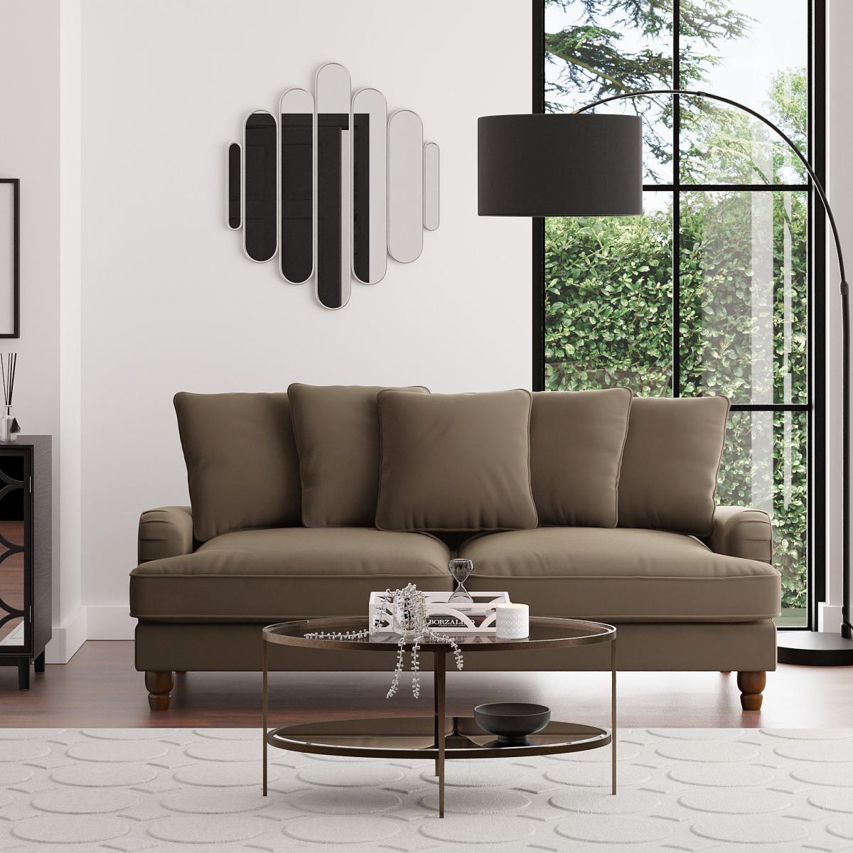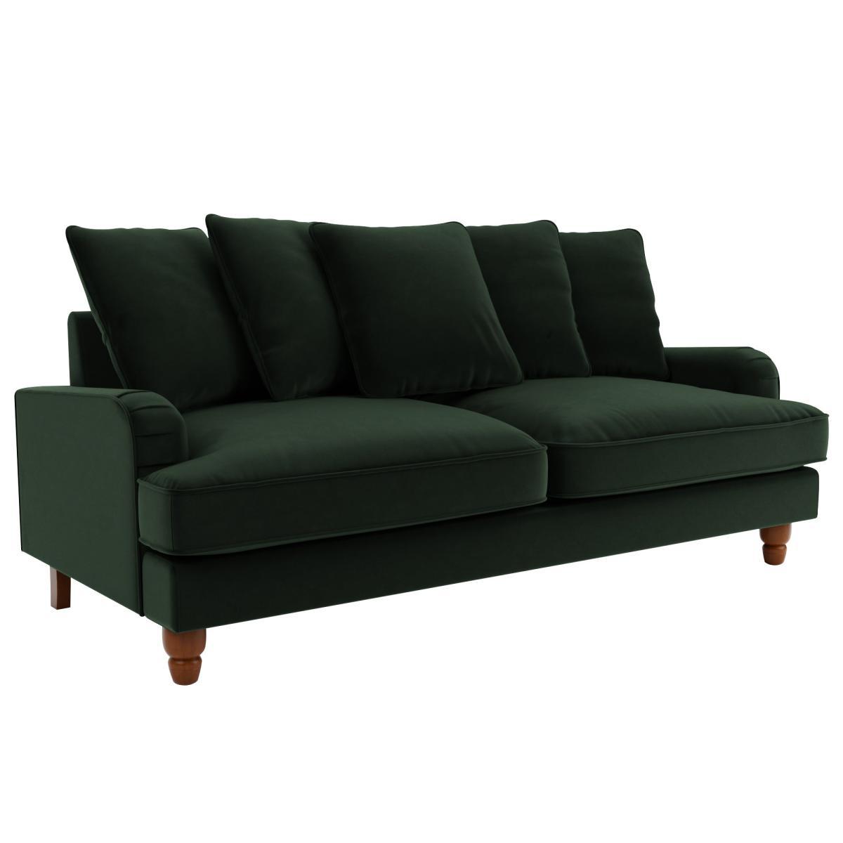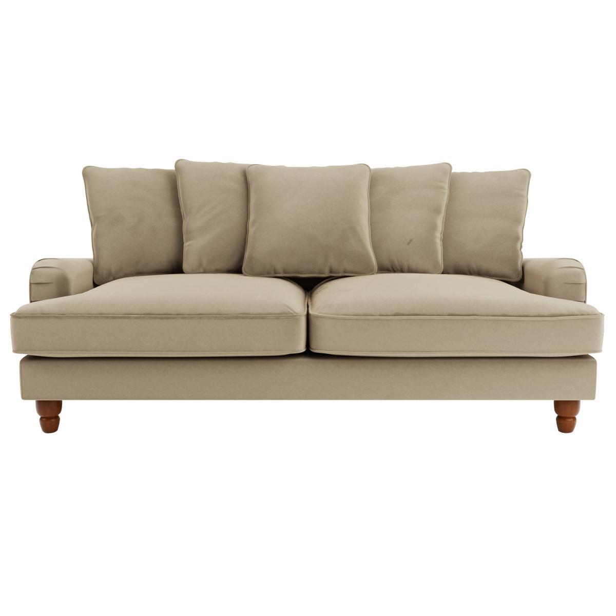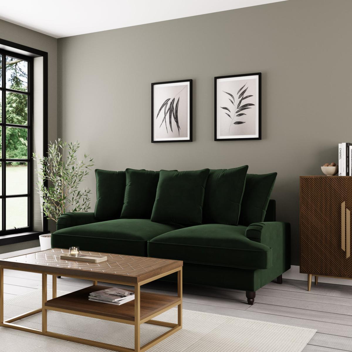 Offering a modern take on a vintage style, the Beatrice Scatterback three seater sofa would make a magnificent addition to any home. This sofa is upholstered in a 100% recycled velvet fabric that's both luxuriously soft and kind to the environment, made using a total of 146 recycled plastic bottles. Complete with a pleated arm design, piped edge detailing and turned, natural finished rubberwood legs, this sofa offers a stunning design that would bring a touch of sophistication and elegance to any room and is available in a choice of gorgeous colours. As well as being undoubtedly stylish, the Beatrice is comfortable too, offering foam and fibre filled seats and a webbed and sprung base to provide optimal support, as well as five plush fibre-filled scatter cushions. Made with recycled materials. To check out our handy sizing guide to help you find out if you’ll be able to get your new furniture into your home.