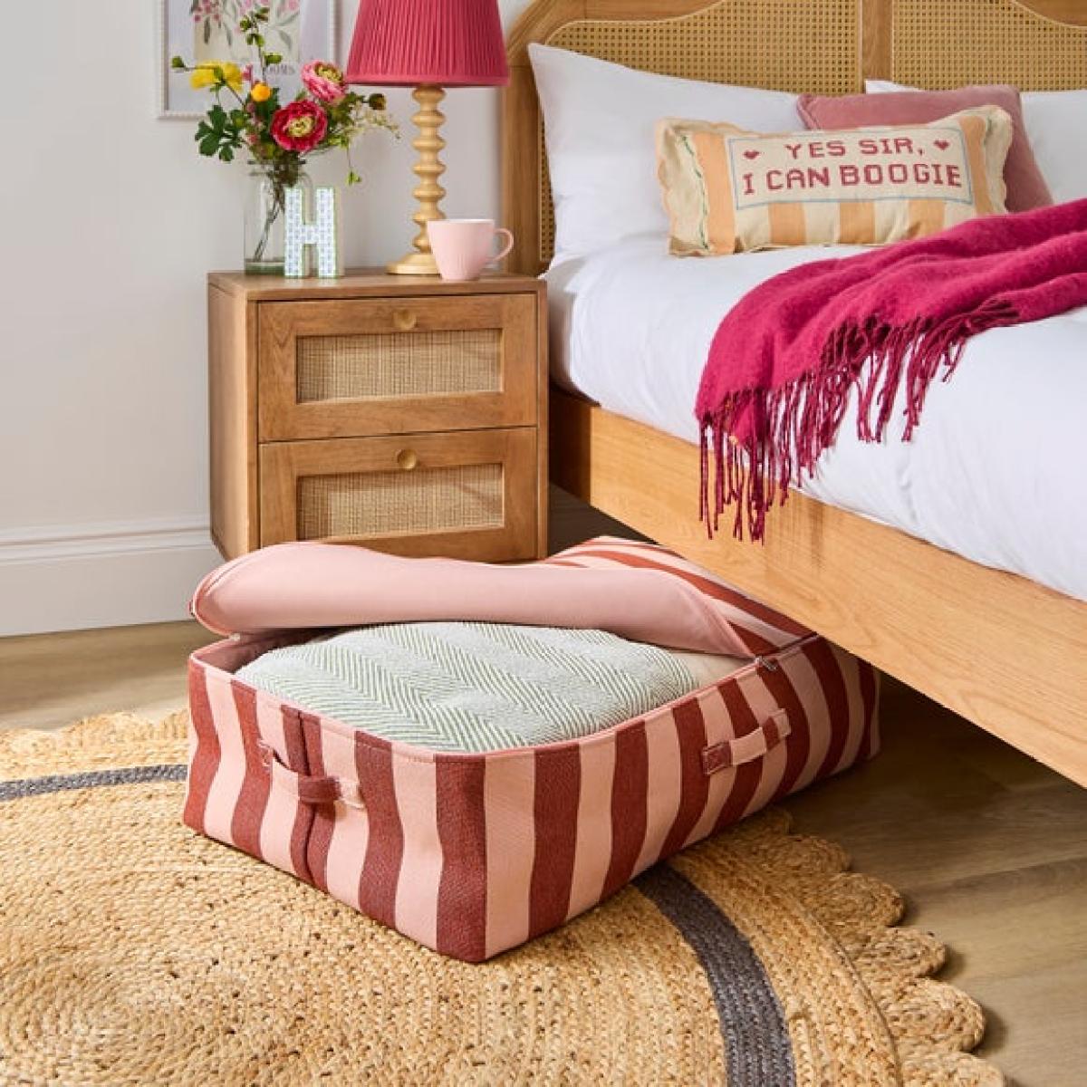 I love this beatrice woven stripe underbed storage because it adds a subtle texture and pattern that complements a variety of interior styles, from Scandi and boho to modern. It’s a practical solution for hiding away seasonal bedding, clothes, or even shoes, helping keep your space tidy without sacrificing aesthetics. This storage bag works well in bedrooms that have a neutral or warm colour palette, where it can blend seamlessly or add a touch of visual interest. For a styled look, consider pairing it with other soft furnishings in similar tones or patterns, and keep the space around your bed clutter-free to maximise its visual impact. It’s a simple yet effective way to make storage functional and stylish.