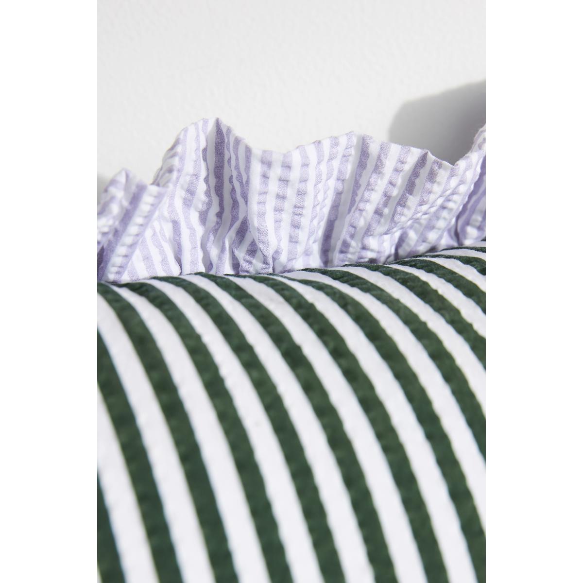 I really like this stripey cushion - it’s a great way to add visual interest without overwhelming a space. Its classic green and white palette makes it versatile, working well in both coastal and smart modern interiors. I’d style it in a relaxed living room on a neutral sofa for a pop of pattern, or toss it on a bed to bring a bit of freshness. To keep things cohesive, pair it with other striped or solid textiles in complementary shades, and consider adding a few textured pieces for added depth. Its ruffled edge lends a charming, casual feel, making it perfect for laid-back, comfortable spaces.