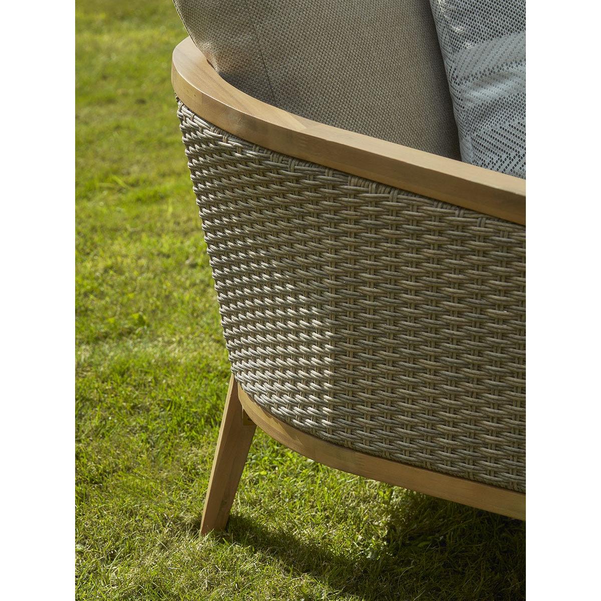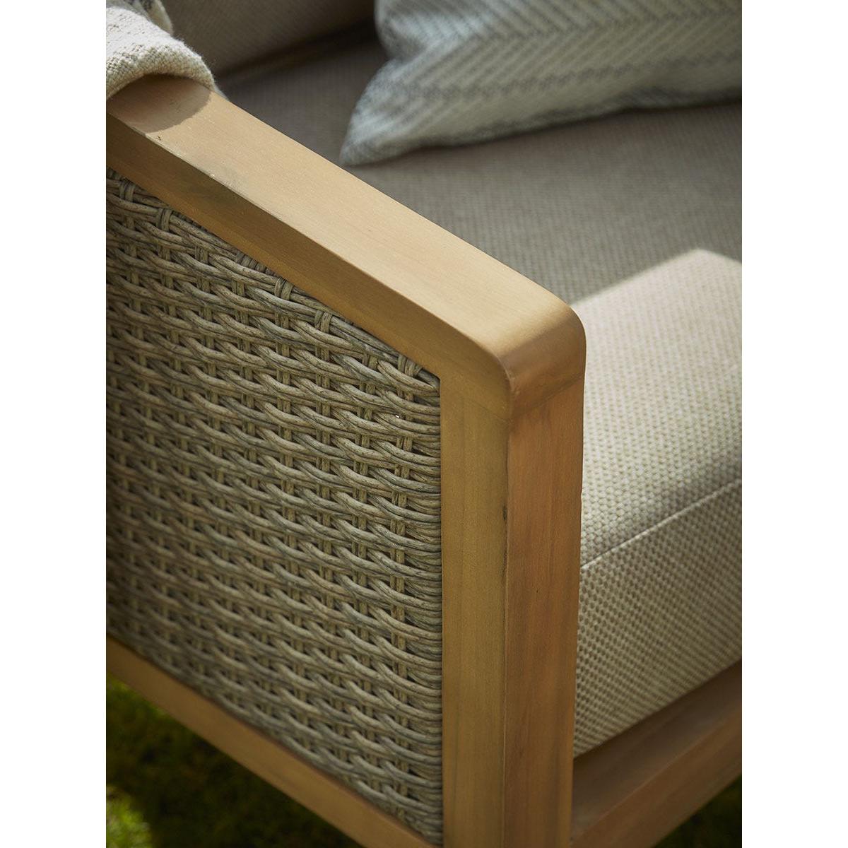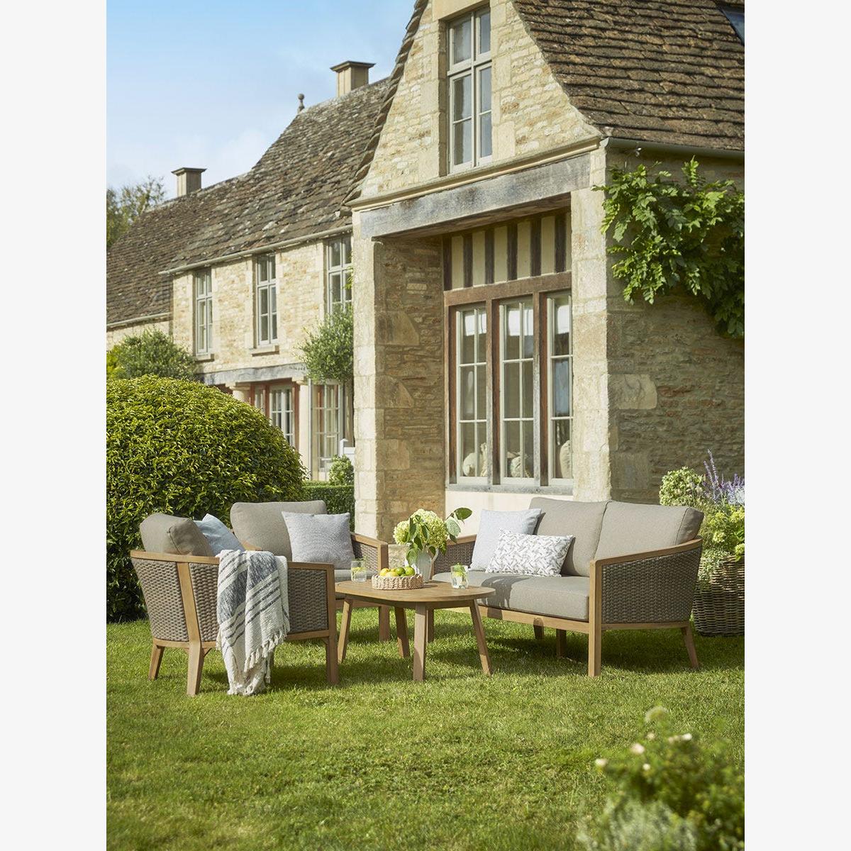 Extend your living space from the home to your garden with our Beaulieu Lounge Set. This garden furniture set features a cosy arrangement of a two seater sofa, two armchairs and a coffee table. Crafted from a warm acacia wood, the centre table sits at the perfect height against the chairs. A soft and tightly woven rattan covers the arms and back inviting a traditional look to the simple frame. Finished with full and plump neutral cushions, this lounge set creates the perfect place to get comfortable and enjoy a warm summers day with friends and family.