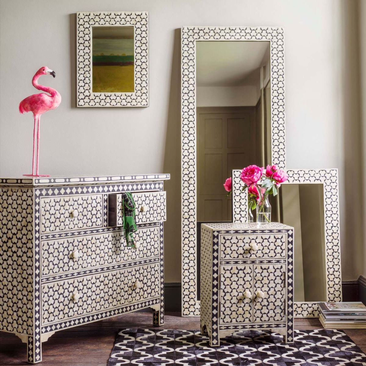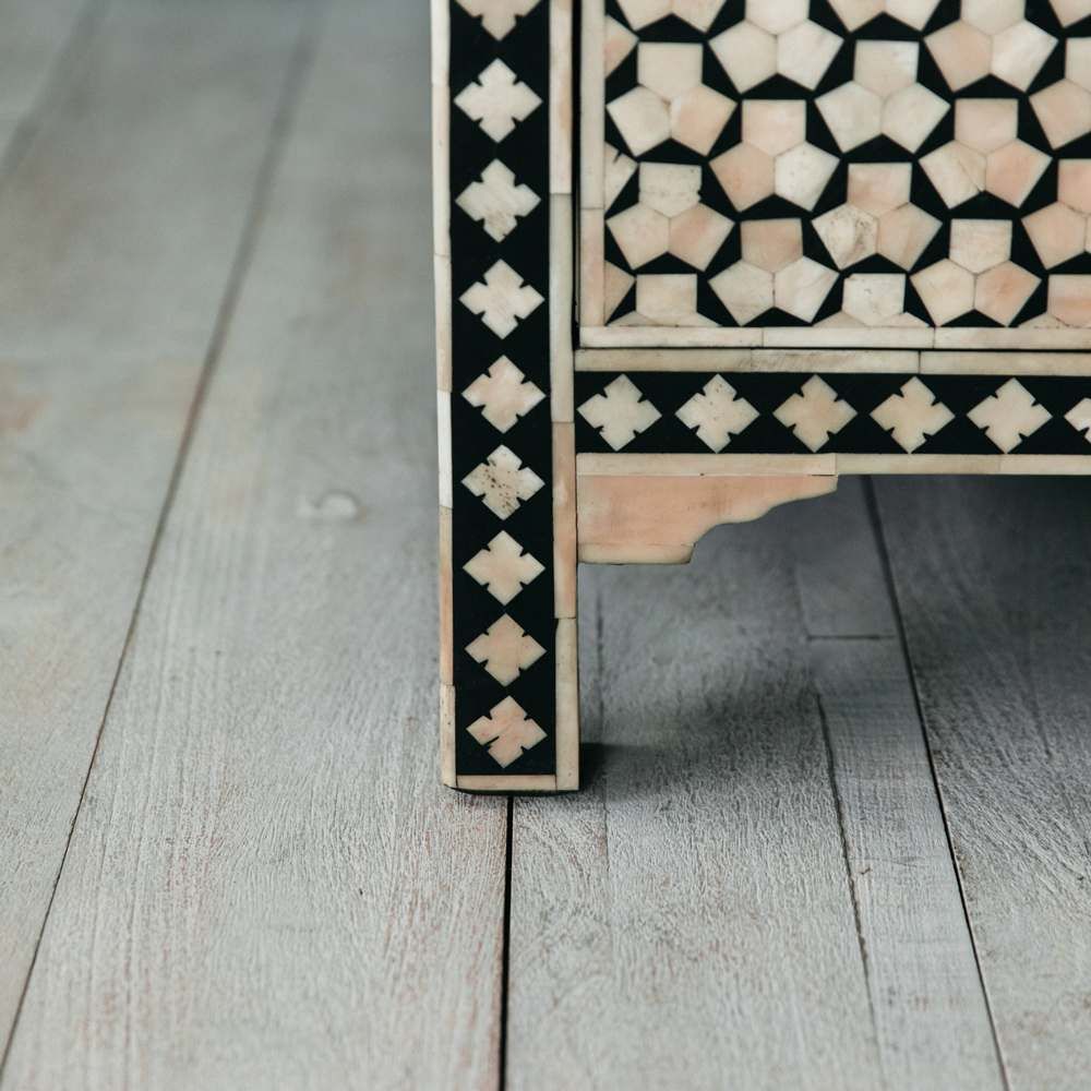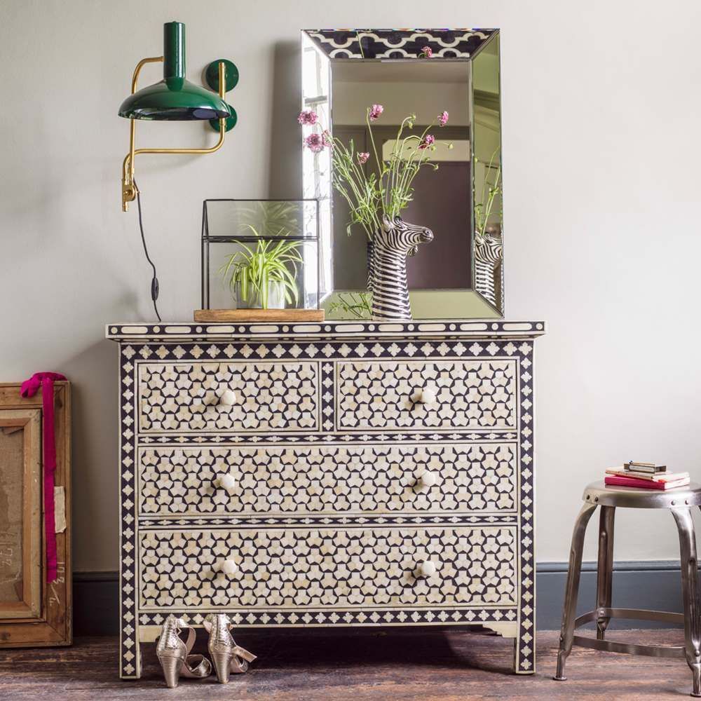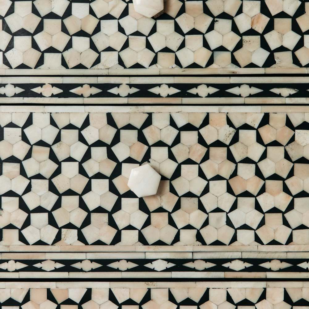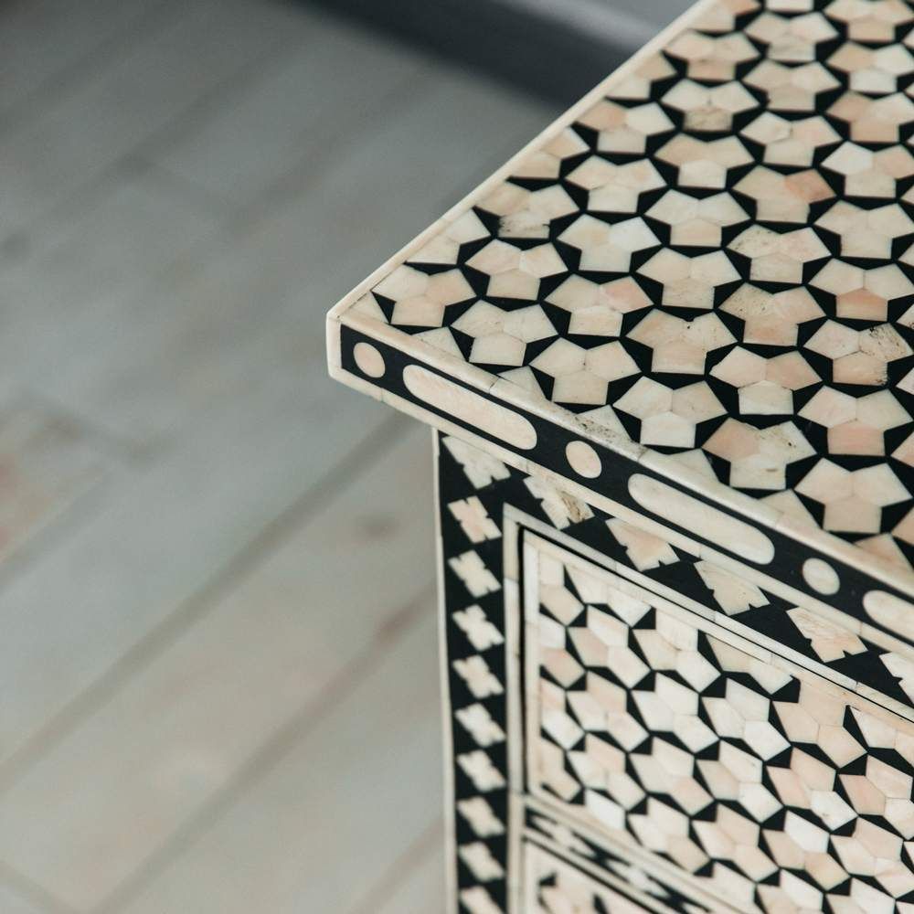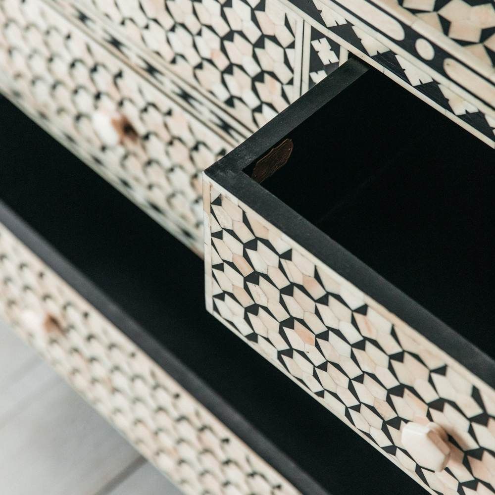 Adorned in geometric mosaics, our Beaumont bone inlay chest of drawers is a beautiful, handcrafted piece of furniture. Made using techniques passed down through generations, skilled artisans in Udaipur, India expertly craft this beautifully contrasting black and white four drawer chest, individually finished with a hexagonally shaped handle.