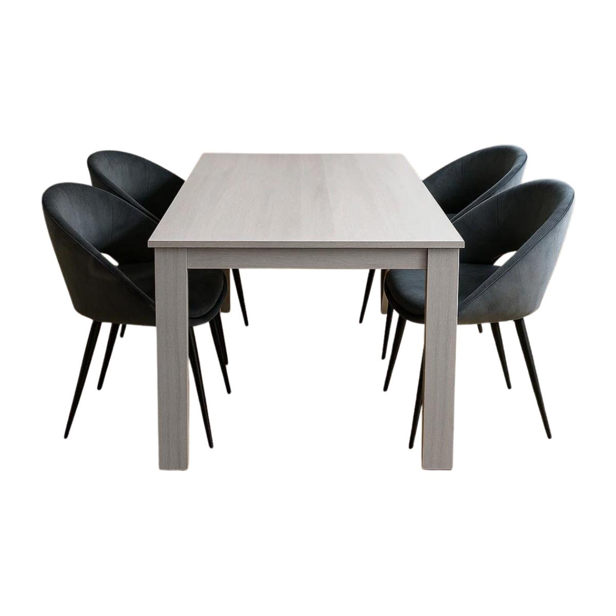 This modern dining set combines style and durability, making it a perfect choice for both contemporary and classic interiors. The rectangular table features a high-quality engineered wood top with a unique arrow effect design, adding a touch of sophistication to your dining space. Paired with four premium grey velvet chairs, this set offers both comfort and elegance. The sturdy powder-coated metal legs ensure long-lasting stability, while rubber-capped feet protect your floors from scratches.