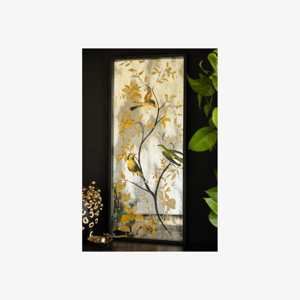 About The Beautiful Bird Wall Art Mirror The Beautiful Bird Wall Art Mirror is a gorgeous design that introduces statement style to any corner of the home. Made from glass with a classic black frame, the long mirror is designed with an antique, foxed finish and a beautiful pattern of flowers and birds. Measuring H76cm, the decoration wall mirror design can be styled on the wall or leaned against a shelf to create impact. Why We Think You’ll Love The Beautiful Bird Wall Mirror Artwork comes in many different forms and we love unique pieces like the Beautiful Bird Wall Mirror that reinvent your ideas of traditional wall art. Bold and effortlessly chic, the antique mirror style is complemented by colourful songbirds, delicate leaves and beautiful flowers in rich yellows and greens. From the calming imagery of birds resting on branches to the vivid golden colour palette, this glamorous decoration wall mirror is destined to be adored. How To Style The Bird Decoration Wall Mirror The Beautiful Bird Wall Art Mirror creates a fabulous feature in any room of the home. We recommend displaying the long wall mirror in pride of place in your living room, hallway or bedroom as a hero art piece that will reflect the natural light in the room. Finally, be sure to style the wall art mirror with plenty of houseplants to celebrate the natural theme!