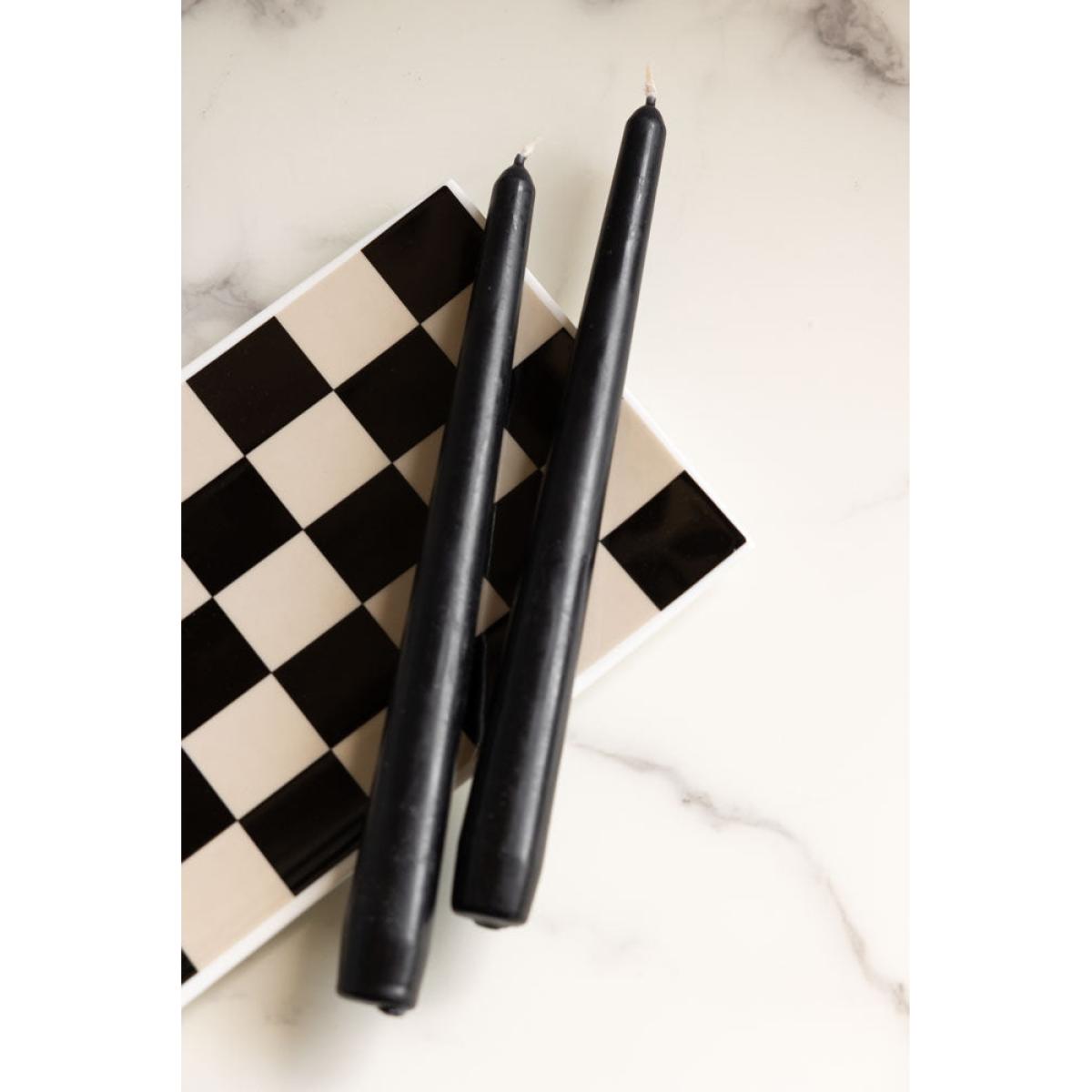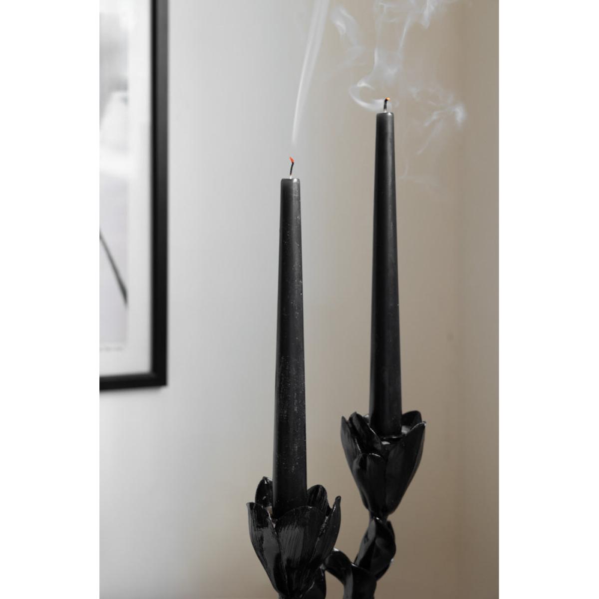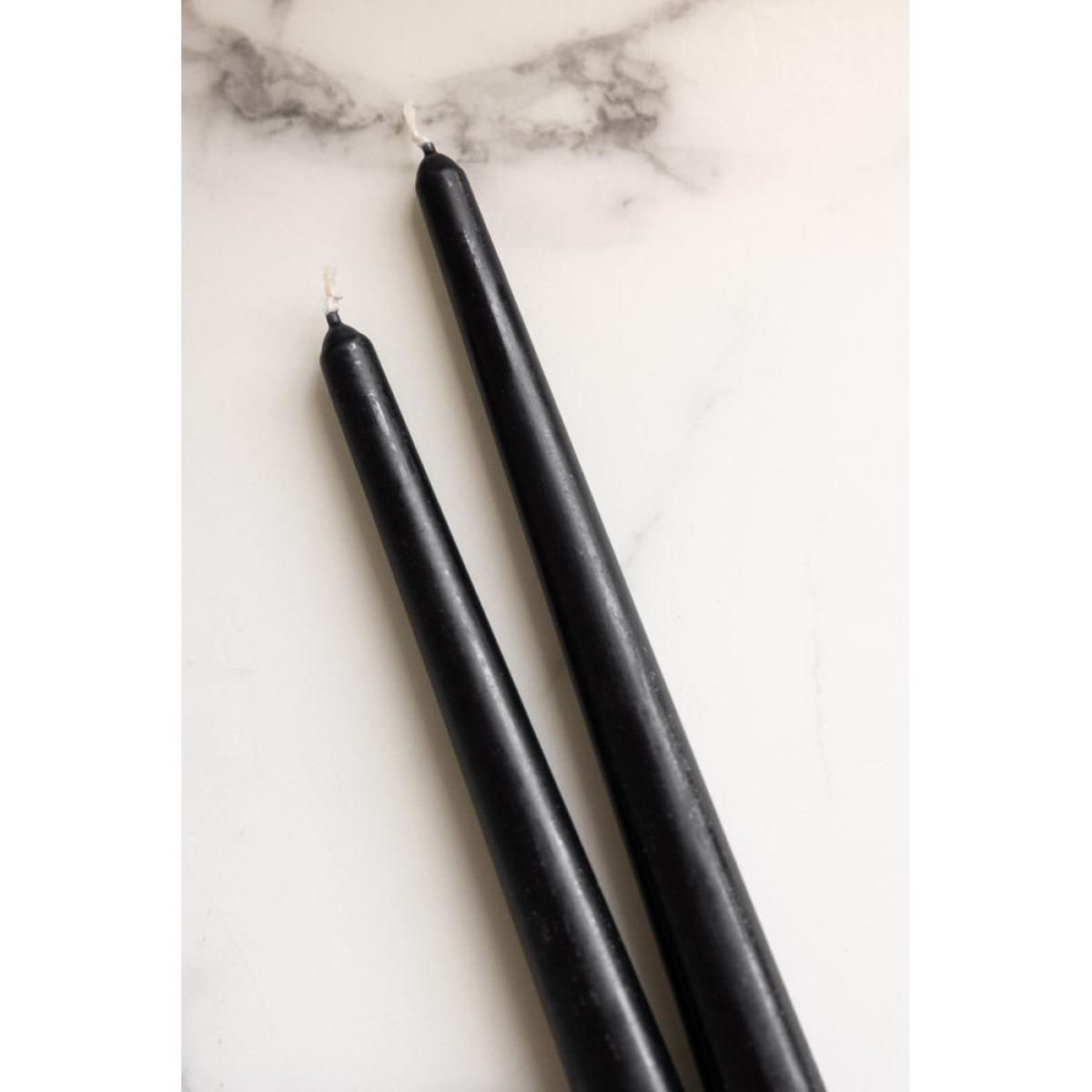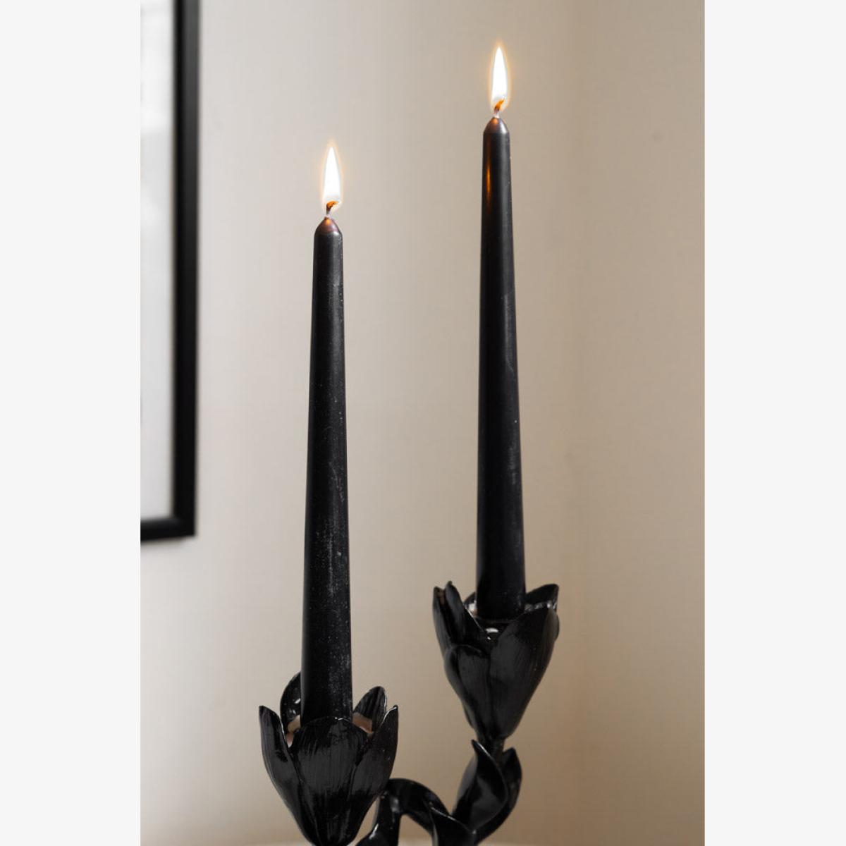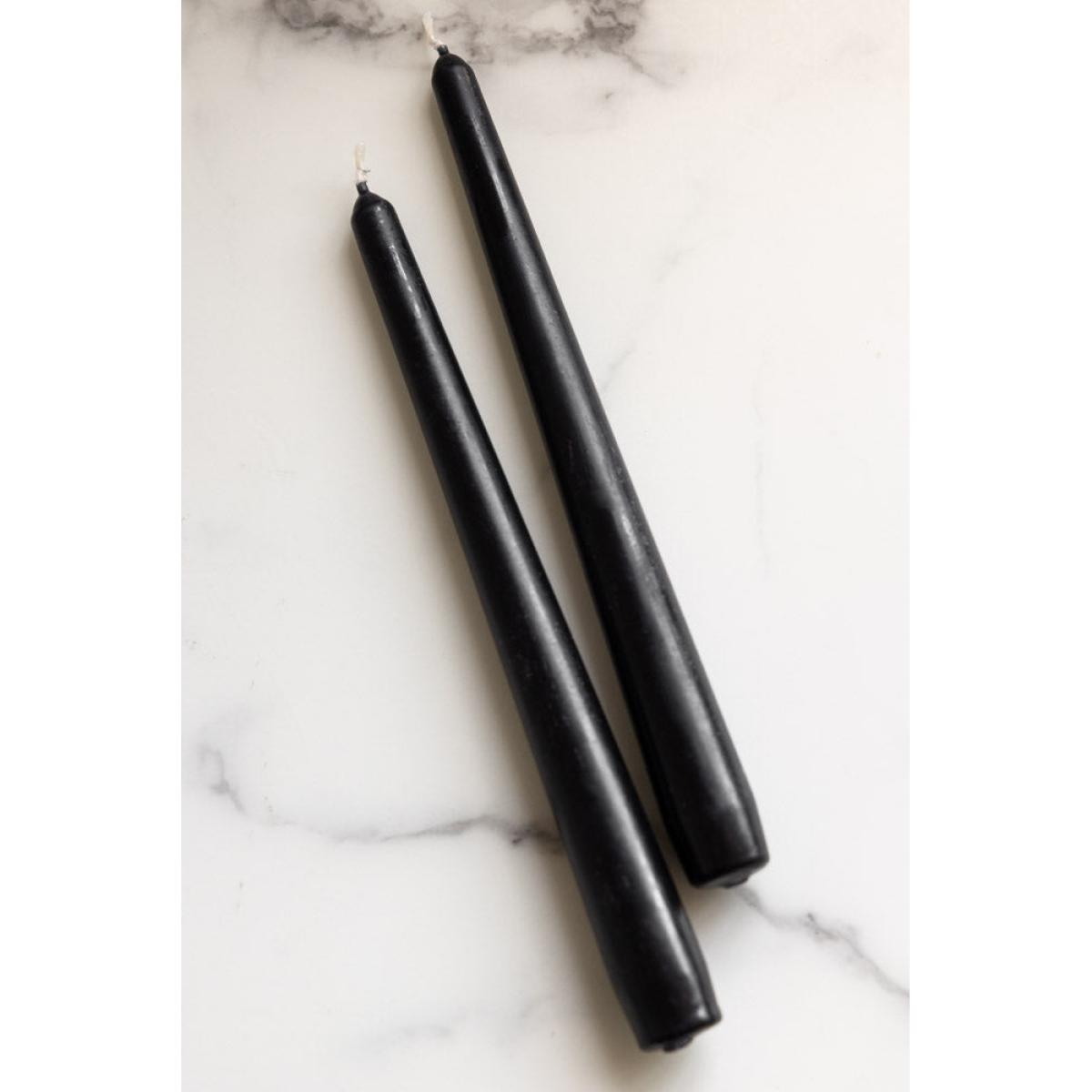 Black tapered dinner candle Measures: H24cm 7-hour burning time Wax burns white Please note that candles must never be left unattended
