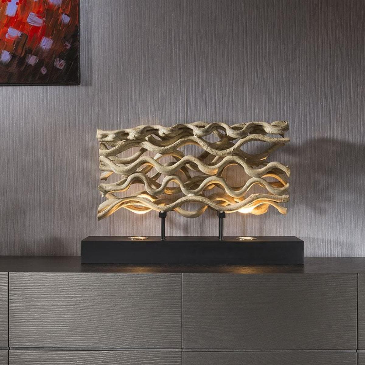 Unique Modern Driftwood/Halogen Table Lamp. A Truly Stunning & Unique Driftwood Design with Elegant Uplighting from halogen bulbs. All mounted on a black wooden base. Made by Europe's top lighting manufacturer, please do not confuse with cheap Asian copies. Please note this is a handmade unique driftwood product, each one will be different. This lamp requires 2 x halogen bulbs (supplied). W80cm D20cm H50cm Supplied with bulbs Modern design