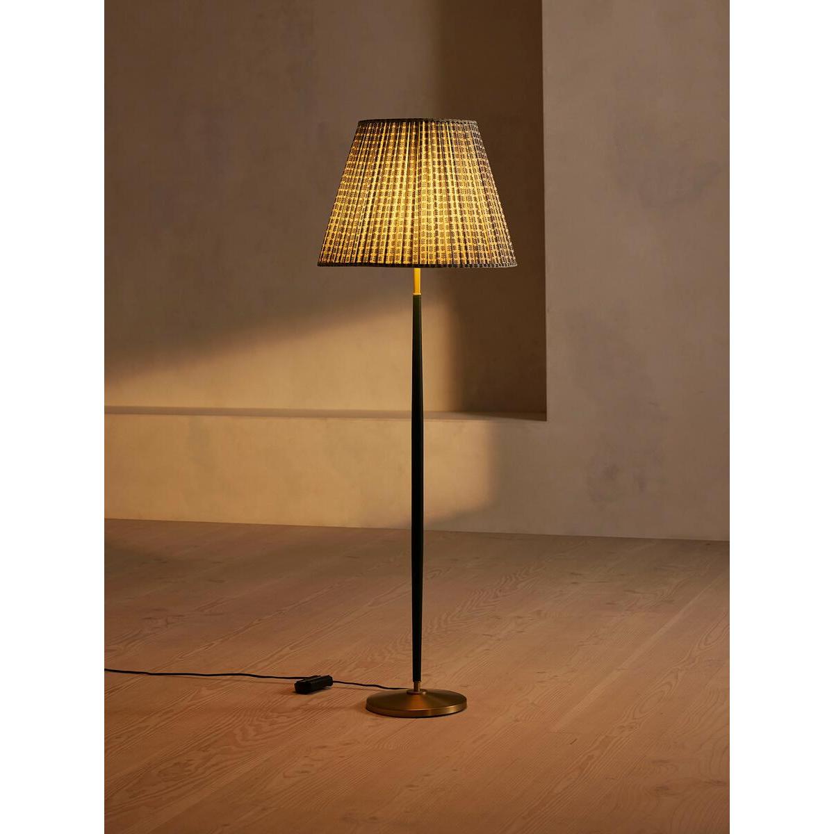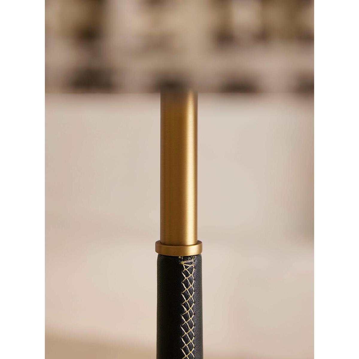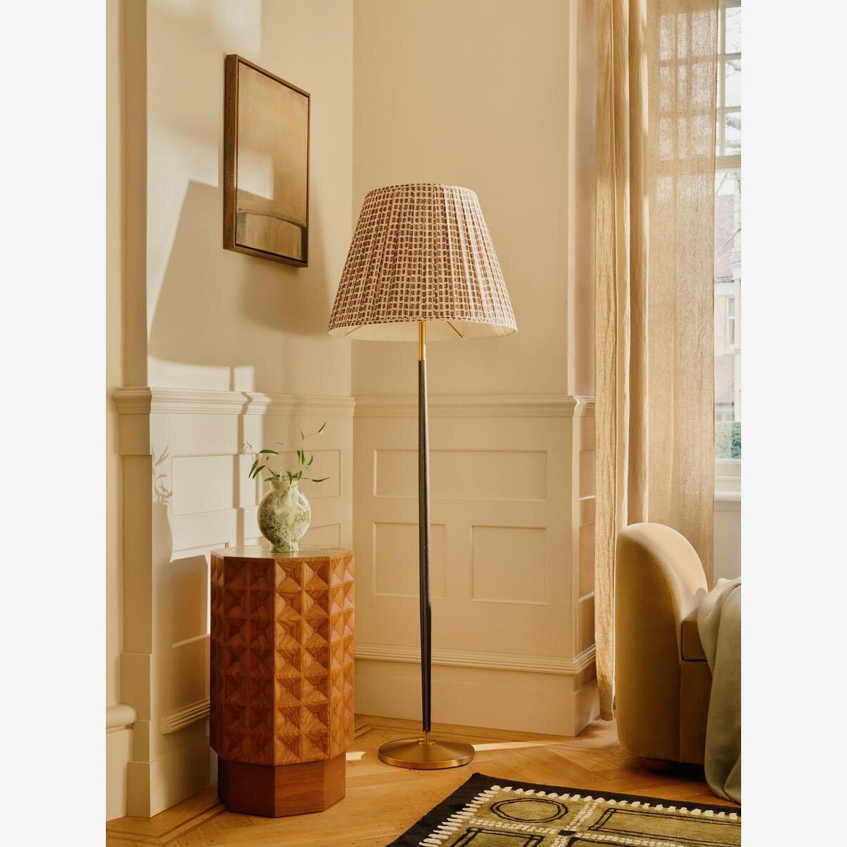 The sleek design of our Beckett floor lamp takes its cues from Soho House 76 Dean Street, where rich interiors can be found in one of Westminster's oldest townhouses. A leather-wrapped base is detailed with hand stitching for an artisanal feel, alongside a patterned drum shade designed exclusively in-house and an antique brass base. Made to emit a warm glow, place in any corner of the room or to light up a hallway. Leather-wrapped body Contrasting hand-stitched detail Antique brass base Patterned drum shade Print designed exclusively in-house Inspired by Soho House 76 Dean Street