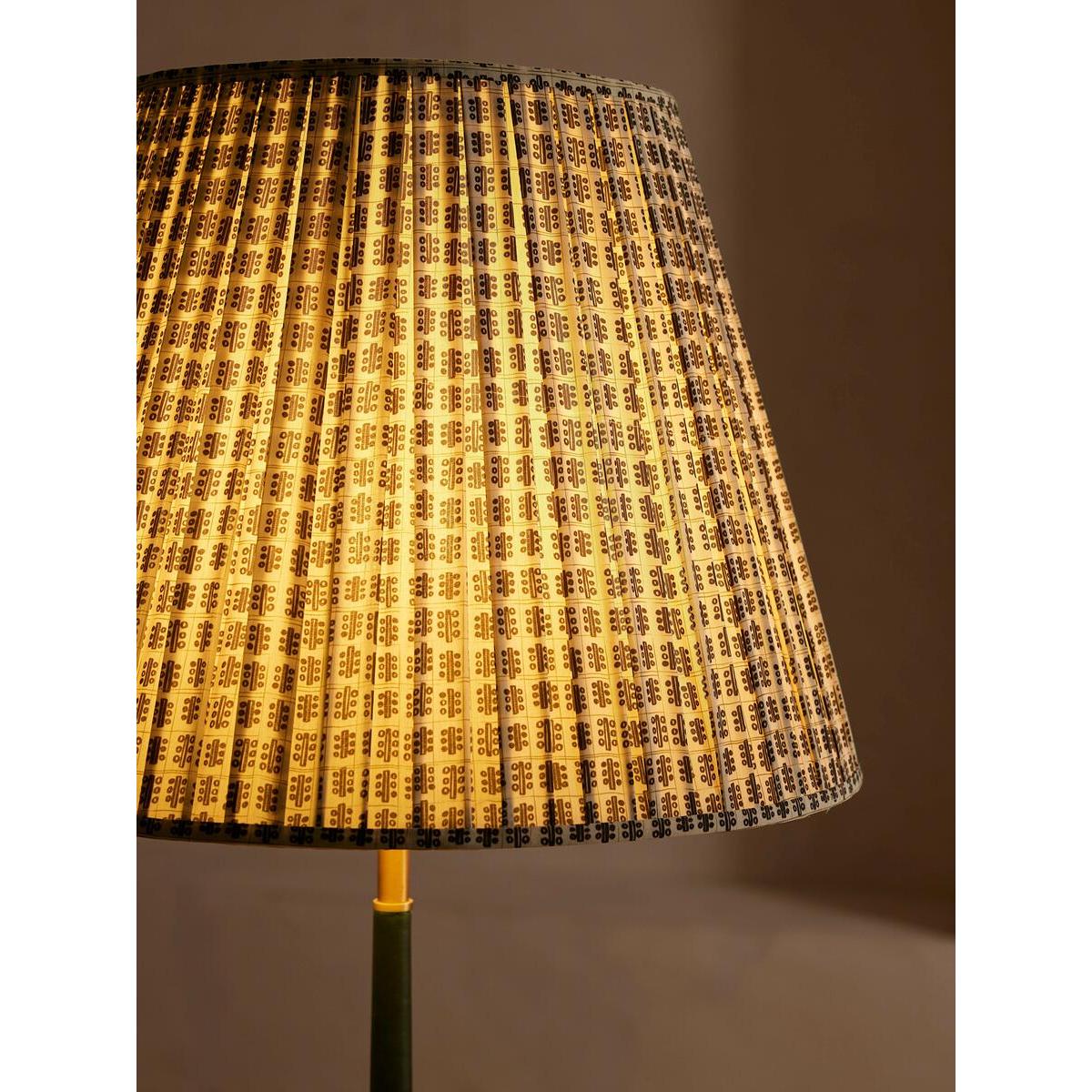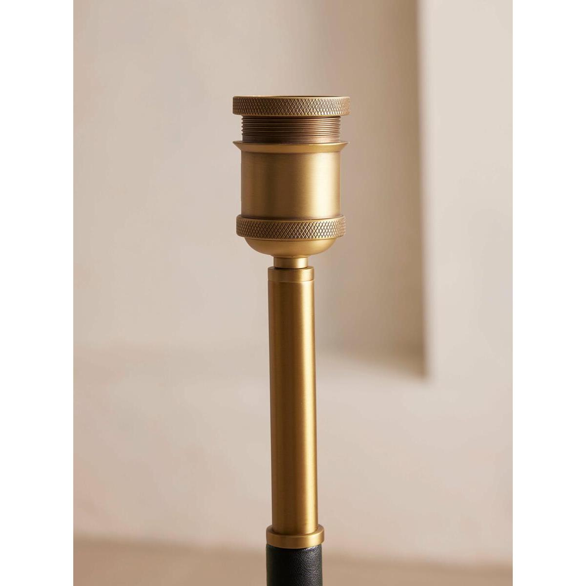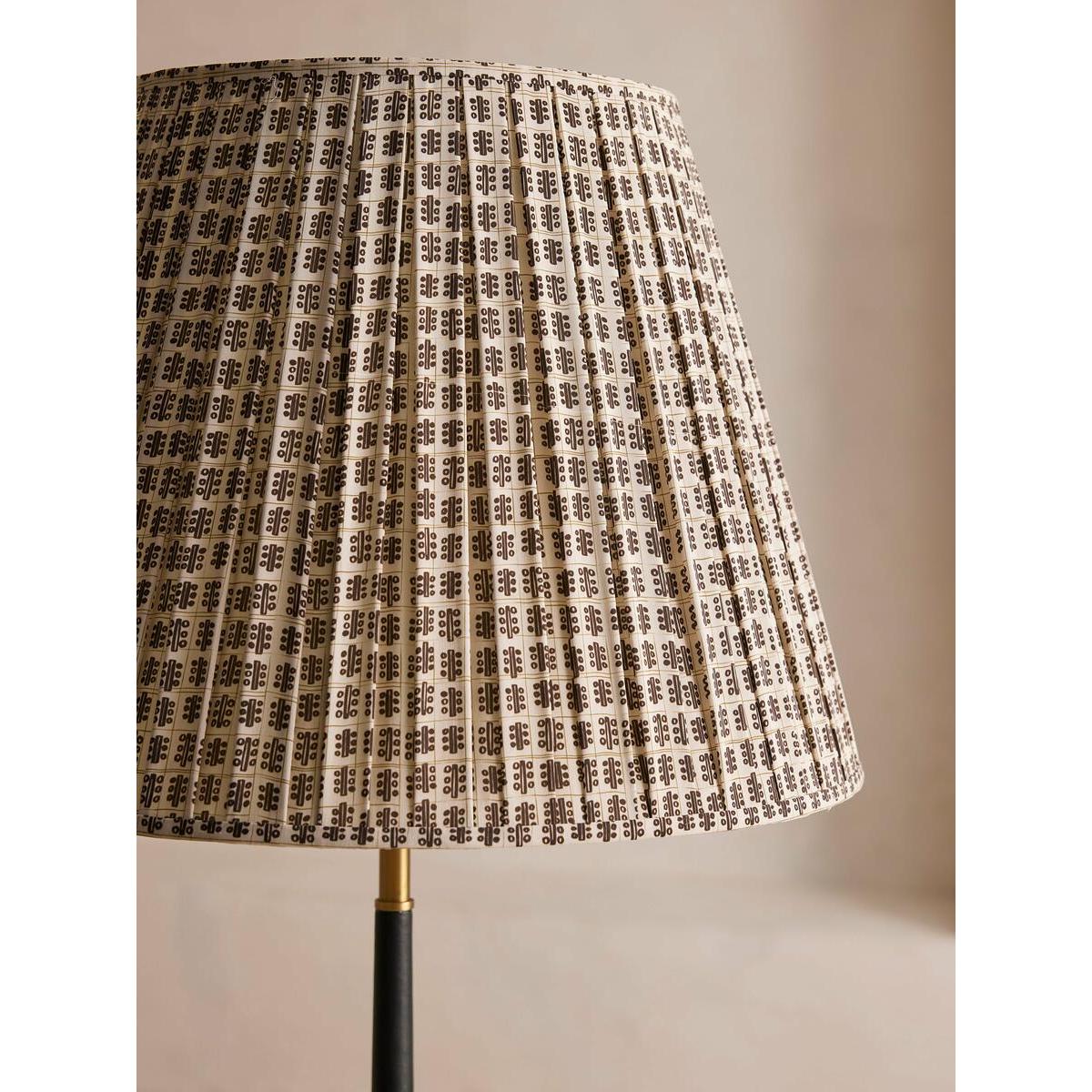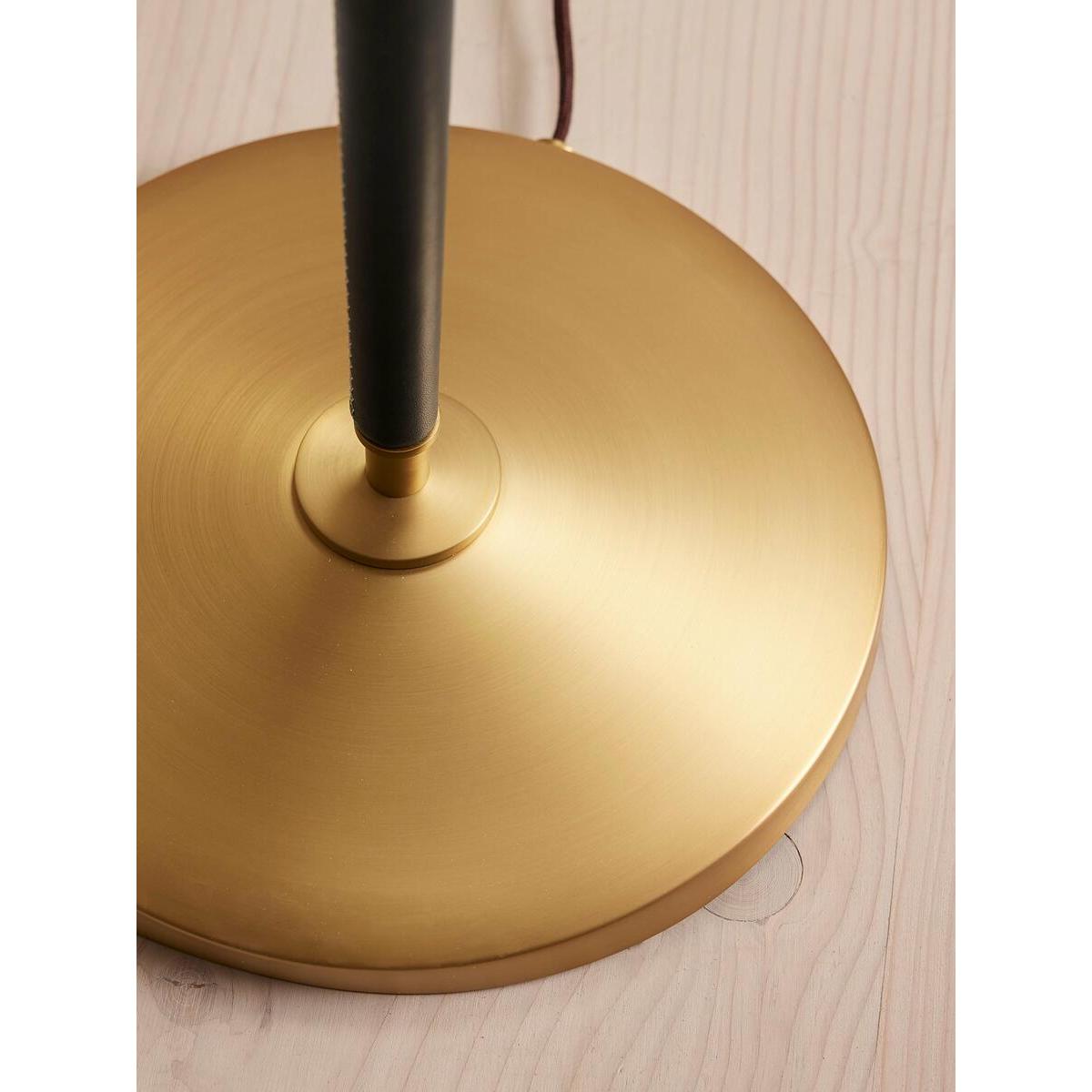 The sleek design of our Beckett floor lamp takes its cues from Soho House 76 Dean Street, where rich interiors can be found in one of Westminster's oldest townhouses. A leather-wrapped base is detailed with hand stitching for an artisanal feel, alongside a patterned drum shade designed exclusively in-house and an antique brass base. Made to emit a warm glow, place in any corner of the room or to light up a hallway. Leather-wrapped body Contrasting hand-stitched detail Antique brass base Patterned drum shade Print designed exclusively in-house Inspired by Soho House 76 Dean Street