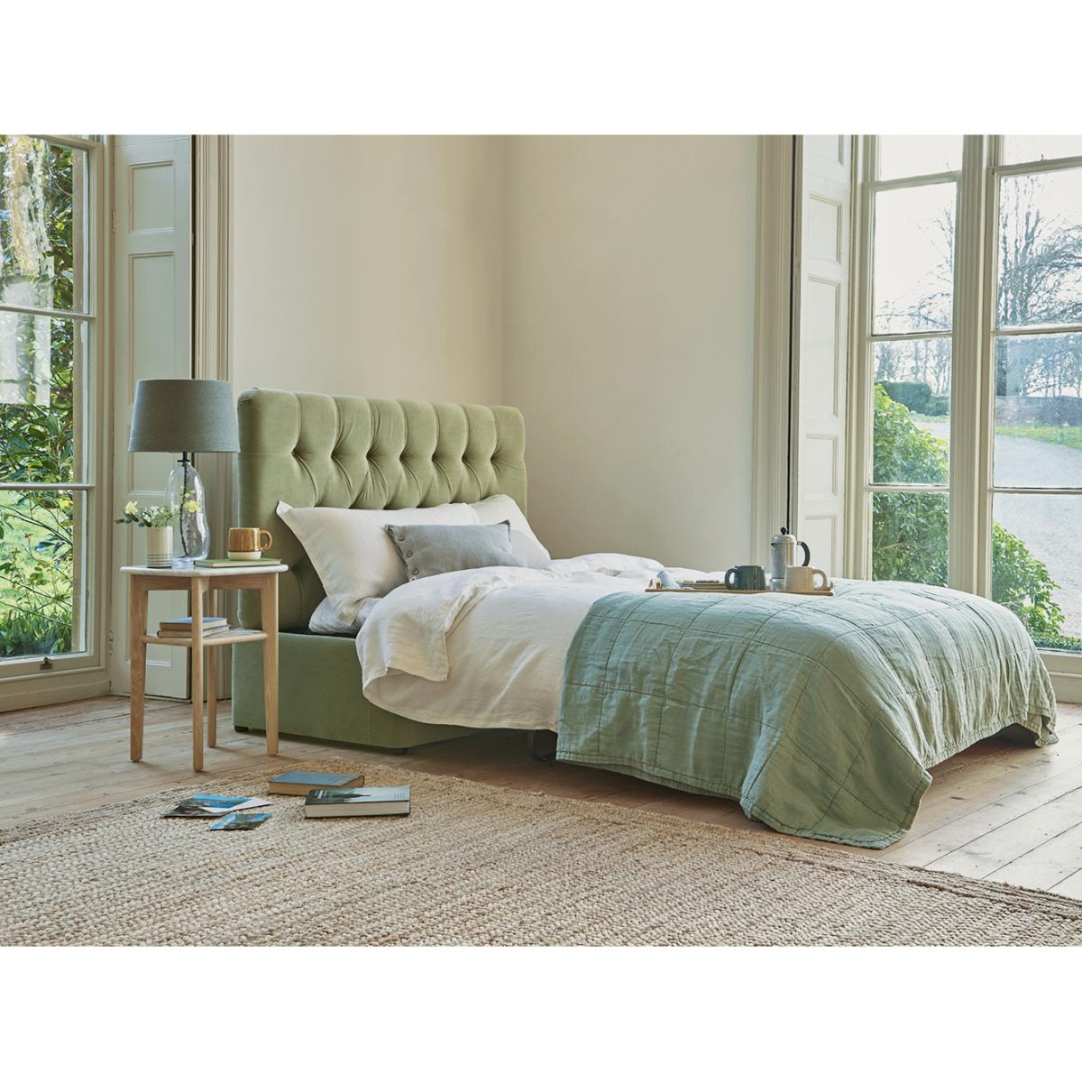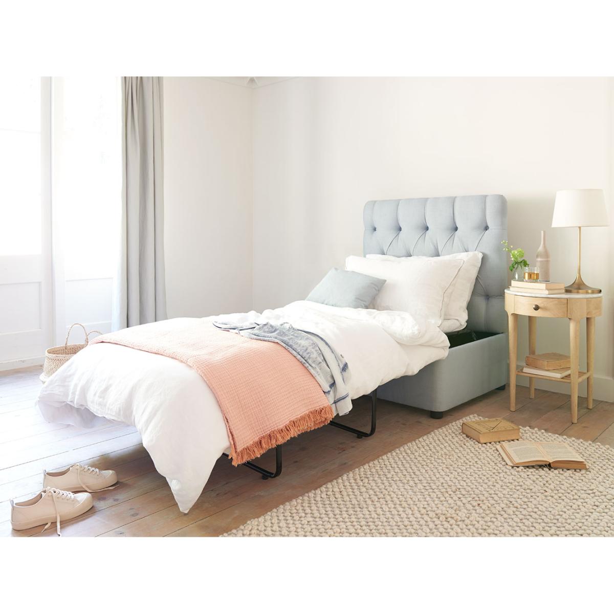 Your relatives will never suspect there's a mattress stashed inside this deep button footstool. How long can you keep it a secret?