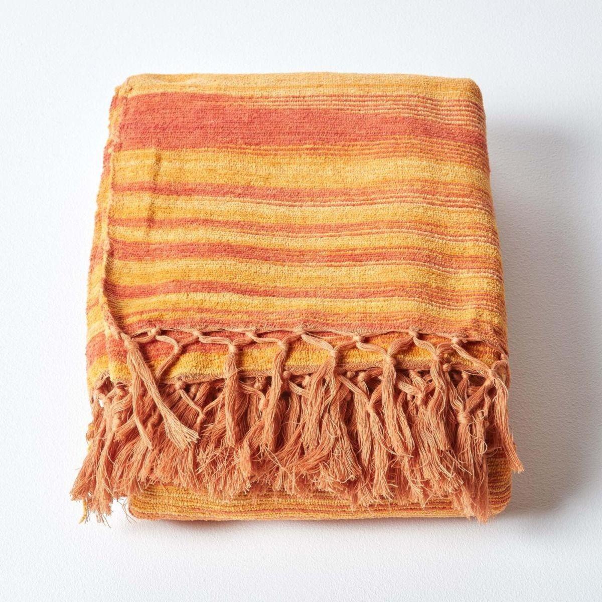 This Homescapes Cotton Chenille range of throws is designed to provide a quick and extremely affordable makeover of any room. Made up of 100 cotton these throws are hand woven on traditional handlooms in India using hand spun yarns. All the colours have been chosen very carefully keeping in mind the current hot trends and the evergreen classic. The graduating shades and the tie dye effect lend a unique charm to the product. The chenille yarn keeps the throws soft and adds to the warmth of the fabric. These throws can be put to multiple uses and yet is economically priced. Available in Beige, Rust, Green and Orange colours.