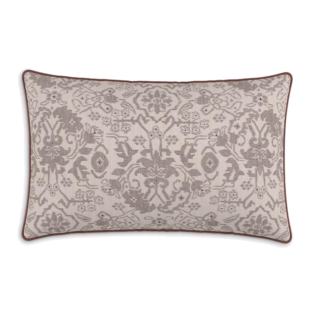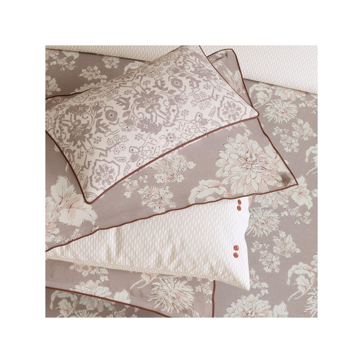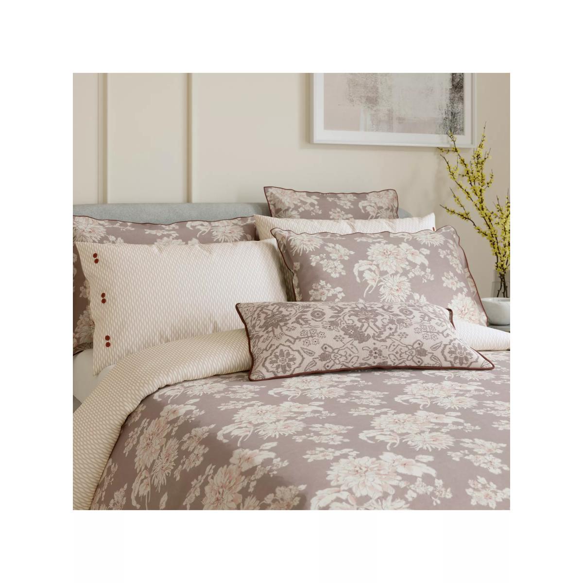This cushion features a sophisticated floral pattern in delicate dusky hues, with a contemporary geometric design on the reverse. Made from crisp cotton percale.