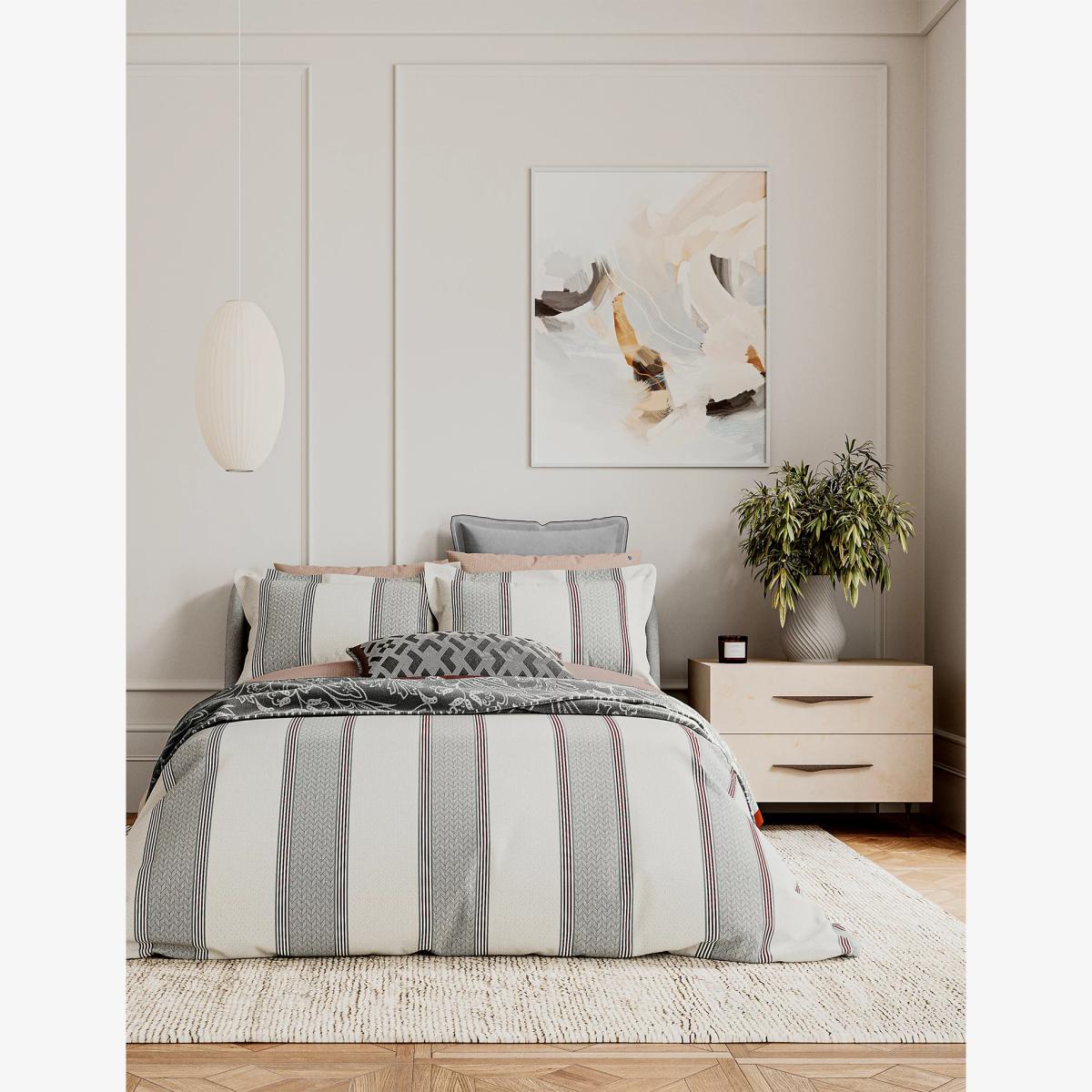 Bold stripes are given an intricate twist with this Bedeck of Belfast bedding set. The large-scale pattern features touches of colour and small geometric designs inspired by traditional Indian block printing. This set is made from smooth pure cotton sateen, with a 200-thread count to ensure both breathability and a sumptuous feel.