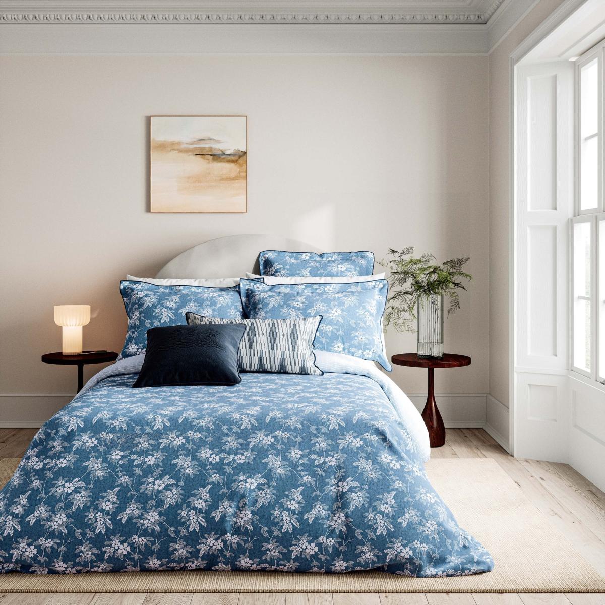 Invite sophisticated pattern into your bedroom scheme with Bedeck Of Belfast Zayda Duvet Cover Set, a floral design in soothing chambray blue perfect for a calm and inviting space. The main bedding design reverses to a small-scale geo stripe. Features 180 Thread Count 100% Cotton Percale Reversible Single Duvet Includes Single Pillowcase Double, King and Superking Size Duvet Set Includes Pair of Pillowcases Care Instructions: Machine washable Please note All screens vary in colour reproduction and whilst every effort has been made to display the colour as accurately as possible it is for guidance only.