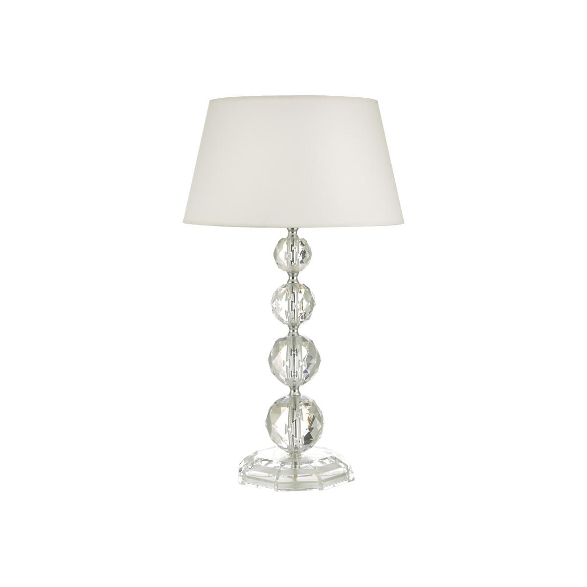 Match an elaborate, luxurious pendant light or chandelier with this beautiful Bedelia table lamp. The elegant crystal-like globes and simple shade make a stunning feature. Why you’ll love it. Gorgeous, well-crafted lamp. Intriguing base design of stacked crystal-like spheres. Simple white shade works in most settings. Eye-catching table lamp or feature light. Made with care for Furniture Village. What you need to know. Hexagon base with stacked faceted acrylic spheres. Features inline rocker switch and white cotton shade. 1 x 60W max LED bulb recommended. Dimensions. Height: 52cm (20.47 in). Width: 30cm (11.81 in).