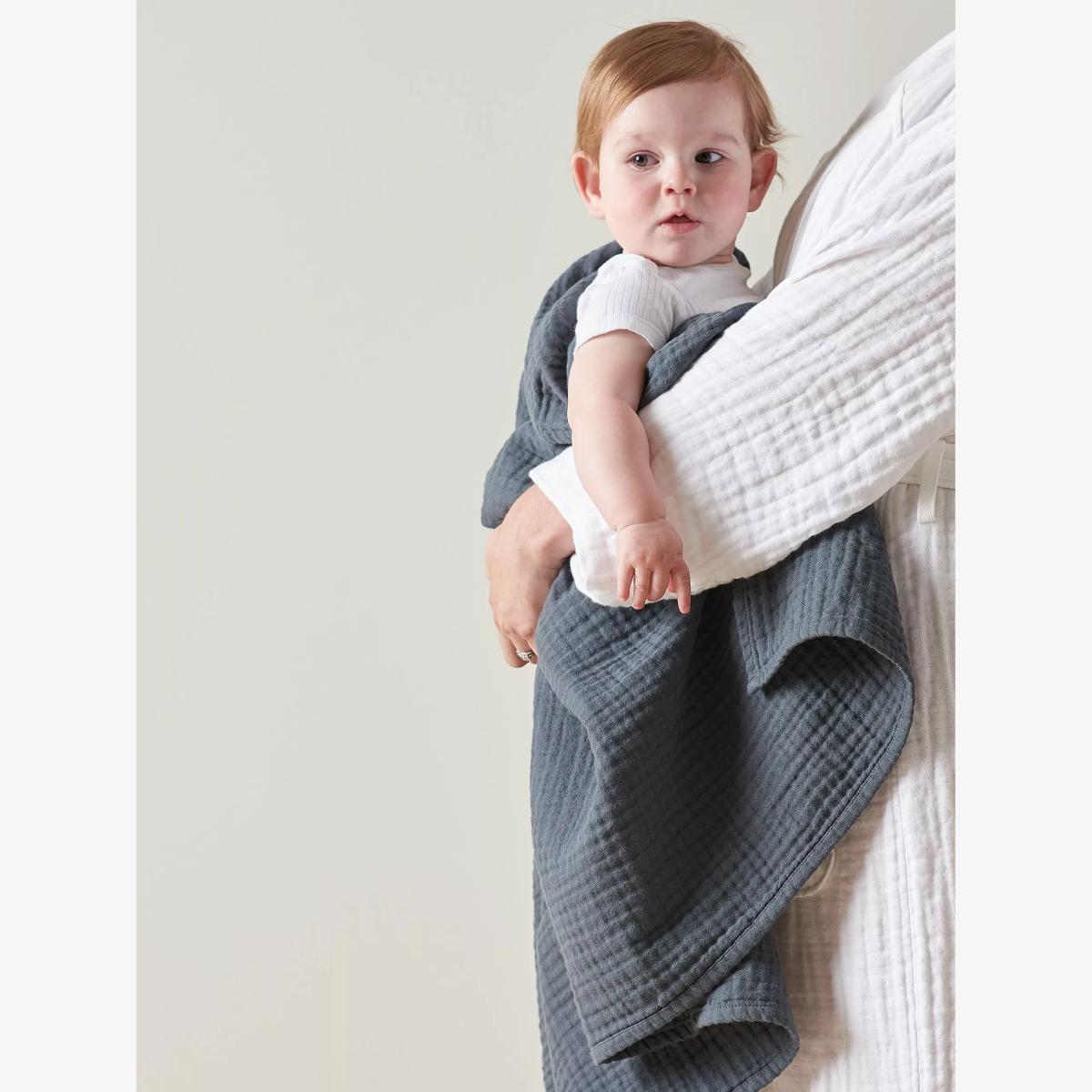 A super-soft 100% cotton baby blanket, with a gentle muslin finish that's perfect for delicate baby skin. An ideal multi-use blanket for the baby days; snuggling at home, nursing, an impromptu play or changing mat, a burp cloth, or on-the-go travel.