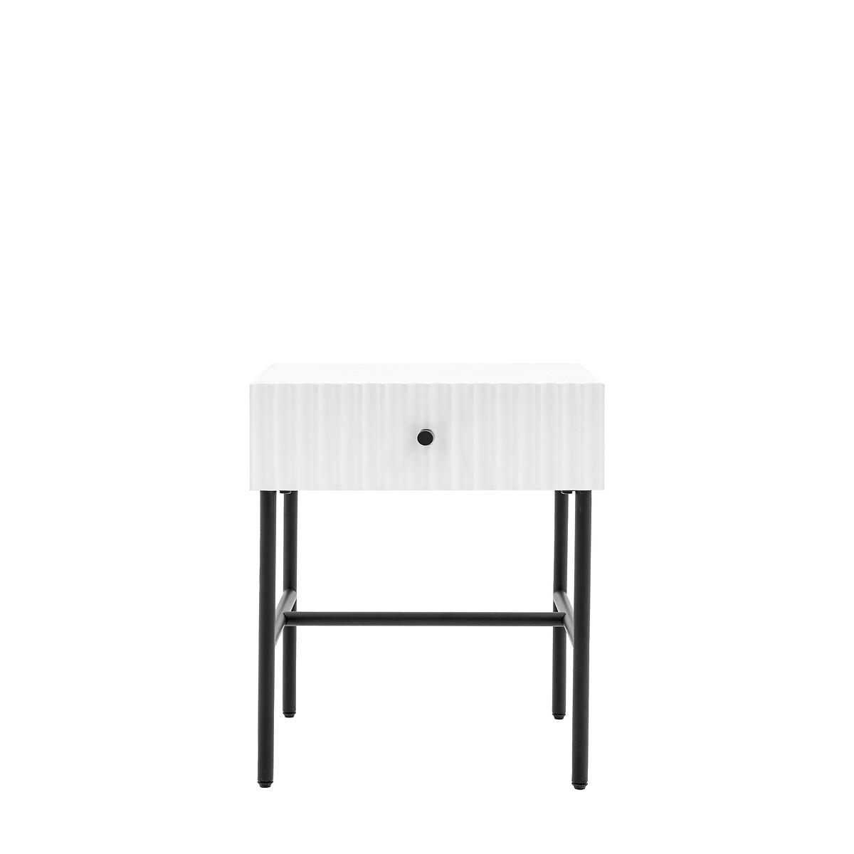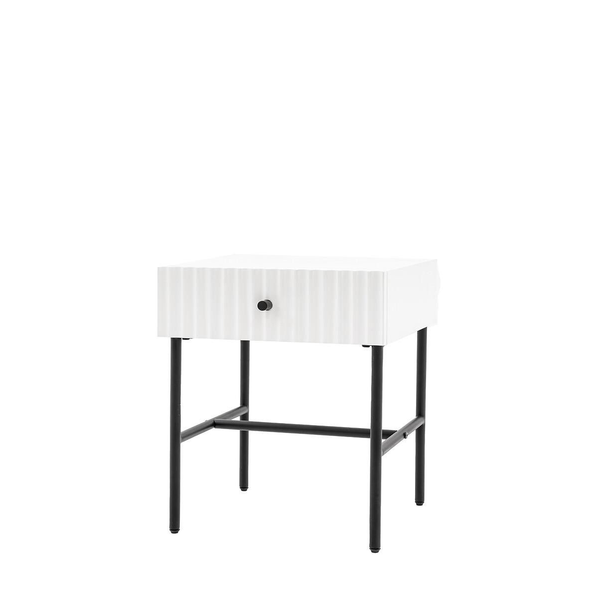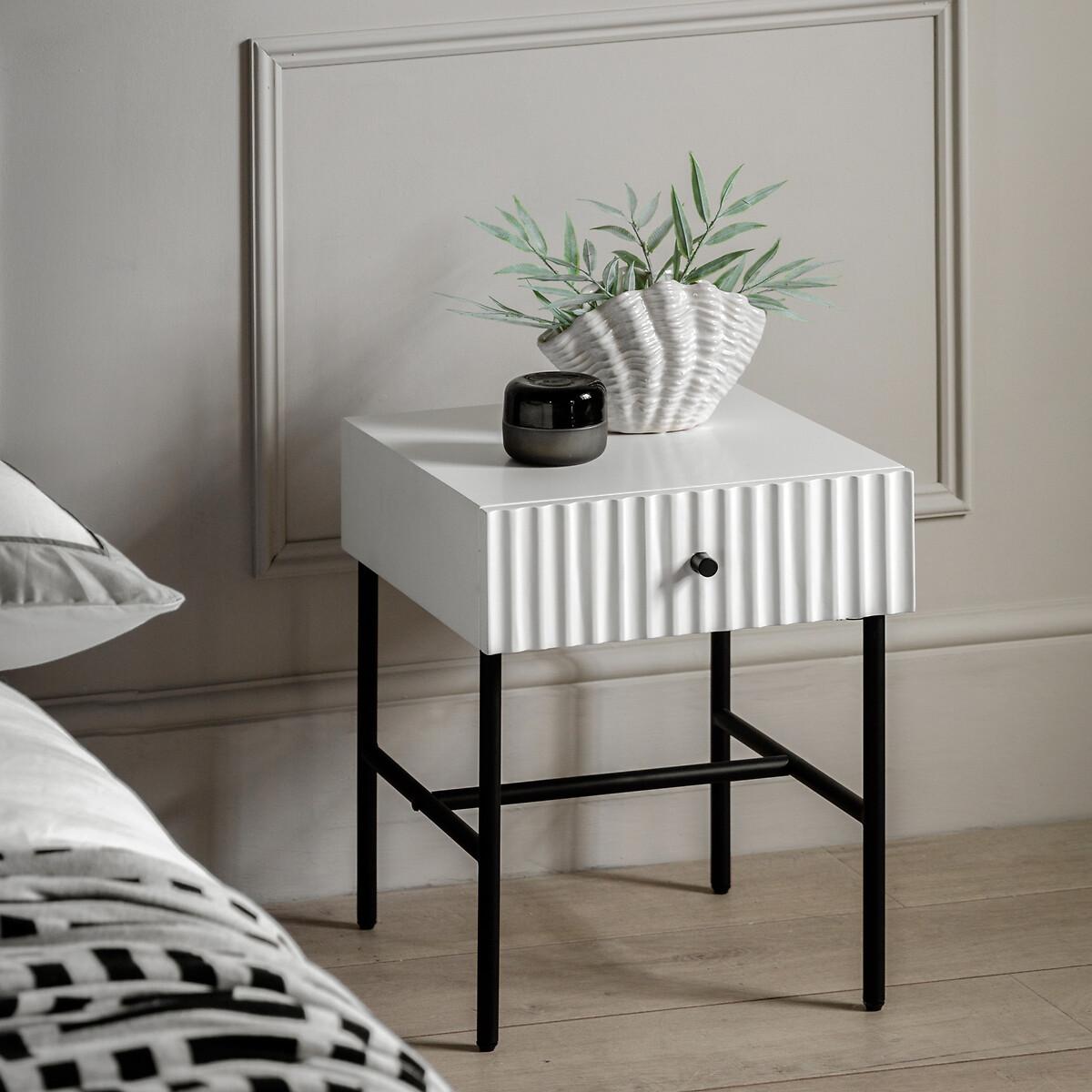 The drawers fascia of this beautiful blue painted bedside table has a stylish vertical scalloped design, adding texture and interest to any bedroom. Black metal legs, a black metal underframe and a metal handle complete the look. Practical storage is introduced with the addition of a drawer. Perfect for any contemporary apartment interior. Product details • Ribbed frontage • Slim straight matte black metal legs • Round matte black door knobs • Storage drawer • Partial assembly required (legs only)Product Composition - MDF Melamine 50% / Iron 30% / MDF 20%Product Dimensions - W40 cm x D40 cm x H50 cm , Weight - 8 KGLeg height - 37 cm Clearance to floor - 37 cm. Internal drawer size - W36 x D36 x H9 cm Package Dimensions - 47 cm x 47 cm x 21 cm, Weight 10 kg. This product will be dispatched by one of our trusted suppliers. You’ll be contacted by their selected courier about your delivery. Please note: this product cannot be delivered to all Offshore Islands, Northern Ireland or Republic of Ireland. GALLE01