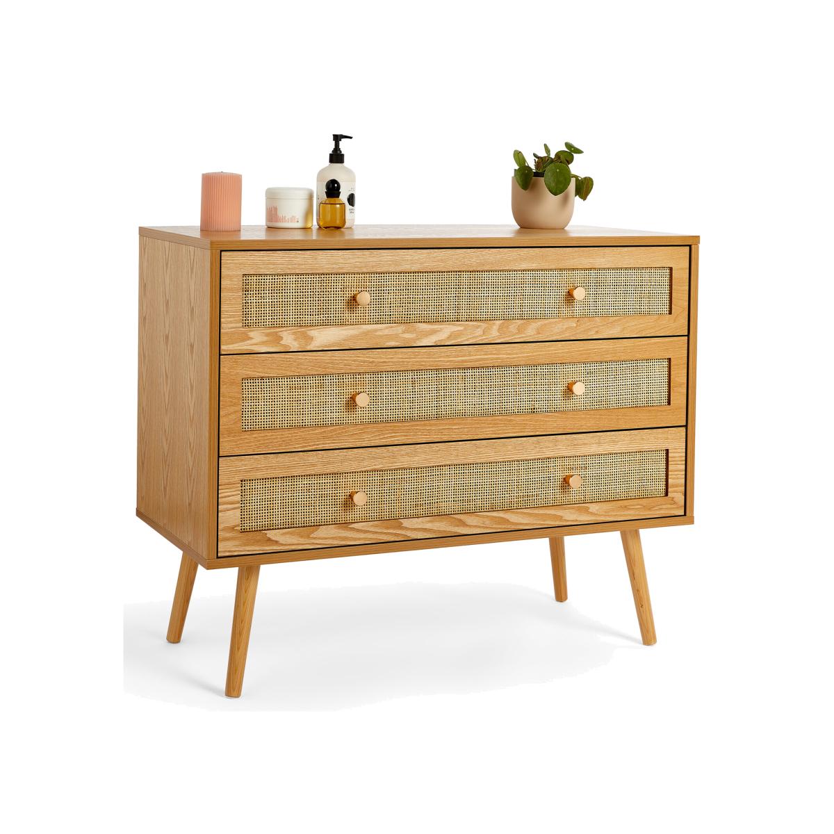 Add a dash of natural bohemia to your bedroom with the BTFY chest of drawers. Adorned by elegant gold effect handles, the charming rattan-fronted bedside drawers are elevated by a touch of luxe. Both undeniably characterful and gorgeously dainty, level up your bedroom, hallway, or home office. Standing atop tapered ash wood legs, use the three storage drawers to organise your spare bedding, blankets, and extra clothes, whilst displaying your fave photos and trinkets on the wide top surface. Finished with a durable wood-effect veneer for a natural aesthetic, your storage unit will add an inviting warmth to any room, striking a unique balance between minimalist Scandi design and shabby-chic detailing. Coordinate your bedroom furniture in charming, woven style with the BTFY Rattan range.