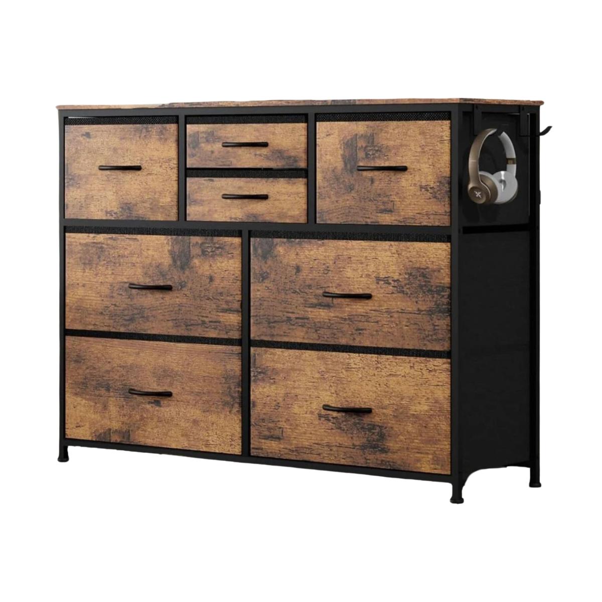 Organize your space with this versatile fabric dresser, boasting 8 collapsible drawers in different sizes to suit various storage needs. The sturdy wood top adds convenience for storing commonly used items. Drawer dimension are for Large (46.5 x 27.5 x 21.5 CM), Medium (30 x 27.5 x 21.5 CM) And Small (30 x 27.5 x 10 CM). Crafted from high-quality MDF and premium non-woven fabric, this dresser is built to withstand daily use. It features a reinforced "double X" support bar and sturdy solder joints for enhanced stability and durability. The foldable drawers are easily removable for quick storage when not in use, while wooden black handles ensure smooth opening. Safety features like the anti-tip kit and twist-in leveling feet provide added security and floor protection. With detailed instructions and labeled parts, assembly is straightforward and hassle-free. Our dedicated customer service team is on hand to assist with any installation queries, ensuring a smooth setup process.