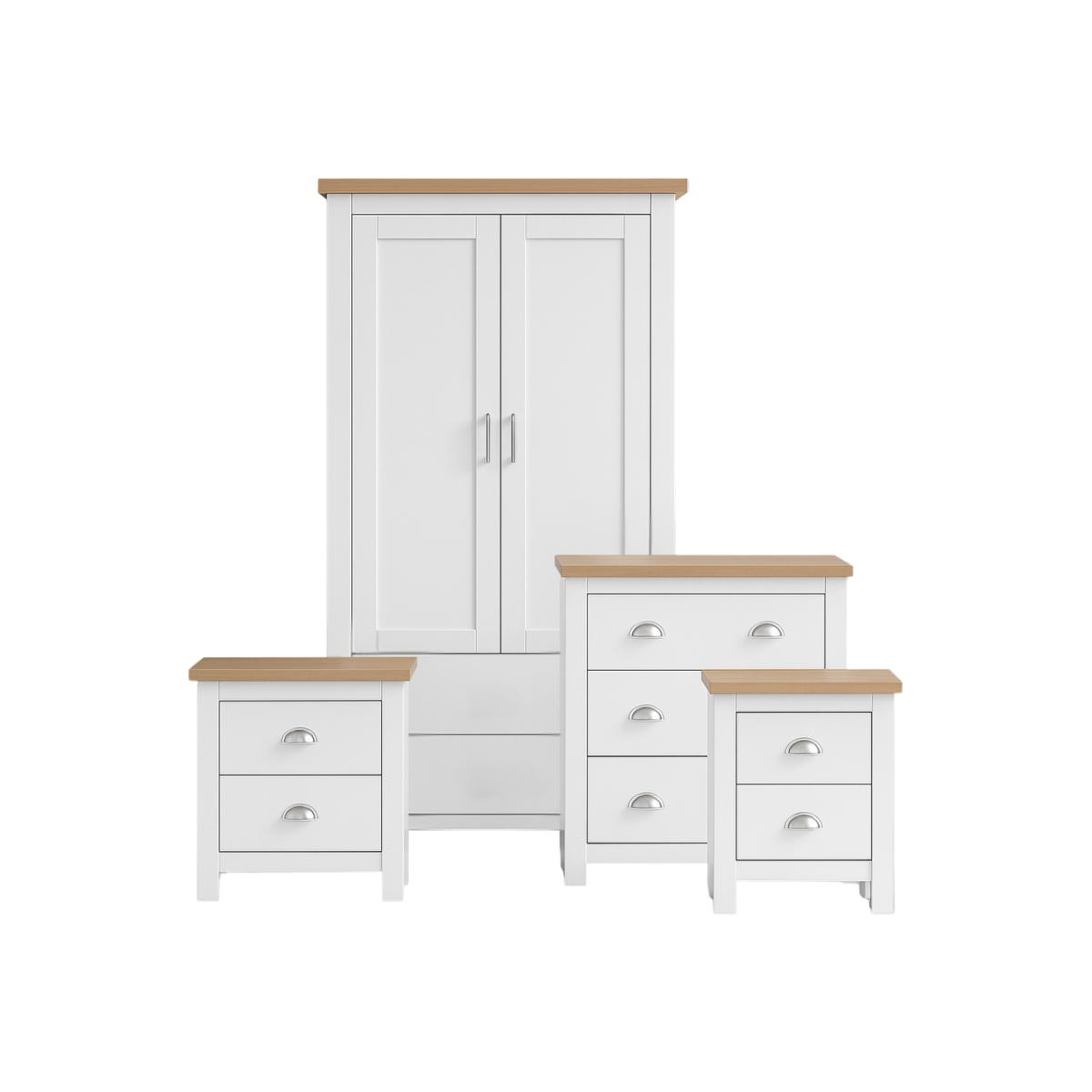 Upgrade your bedroom with this elegant 3-piece furniture set, combining ample storage with timeless style. The set includes a spacious wardrobe with hanging rail, shelves and drawers, a 4-drawer chest for folded garments and essentials, and a 2-drawer bedside cabinet for convenient night-time storage. Designed with a warm wooden top, crisp white base and sleek metal handles, this collection blends modern elegance with everyday functionality. Dimensions:Wardrobe W79cm x D52cm x H180cm, Chest W79cm x D40cm x H95cm, Bedside W45cm x D40cm x H51cm.