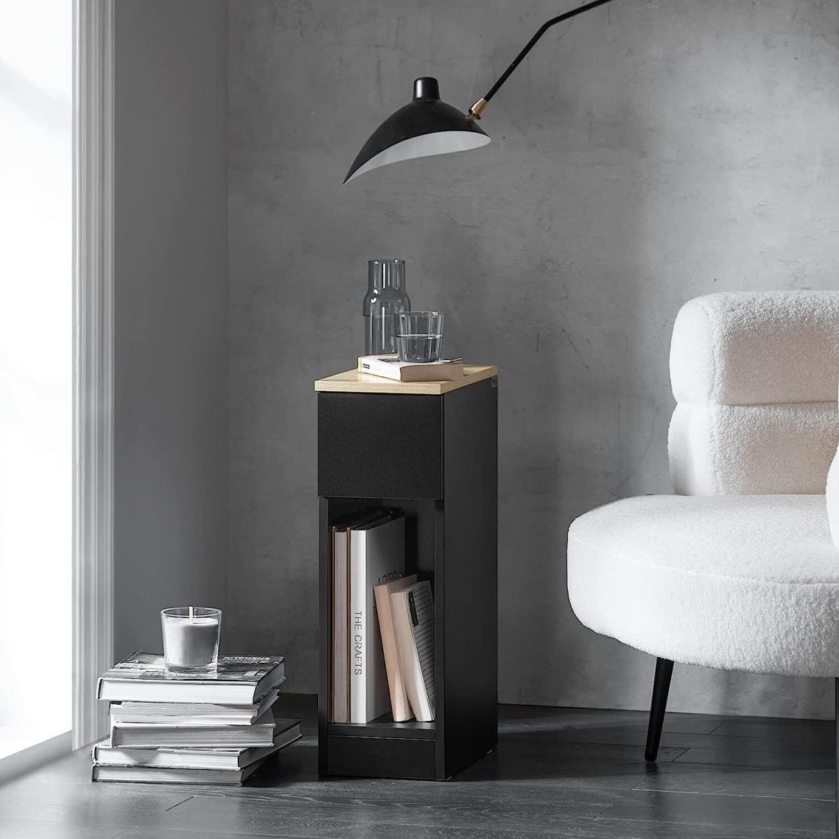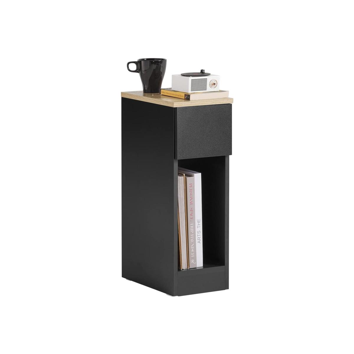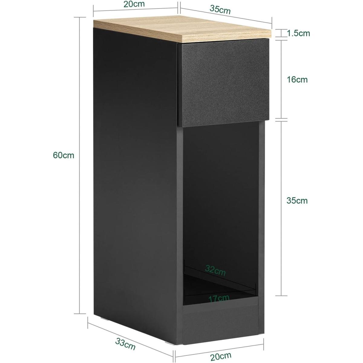 This side table nightstand creates a distinctive and modern atmosphere for your home. It is great to be used as a sofa side table or bedside table for you to get accessible to what you need. It offers ample storage space for books, magazines, remote controls, glasses and other small items, keeping your room tidy and organized. A slide-out drawer provides ample storage space for your personal items. The storage compartment beneath the drawer and the top shelf offer additional storage and display space for you. Practical and space-saving, it is a good addition to any room. 20cm in width, it is also ideal for any corner and gap. Elegant and simple design, it matches any home decor perfectly. Material Particle board, MDF.Dimensions W20 x D35 x H60cm. Weight 7.3kg. Load capacity 20kg. Item comes in a flat pack and requires self-assembly. Detailed instructions are supplied. The decorative elements are not included in the delivery.