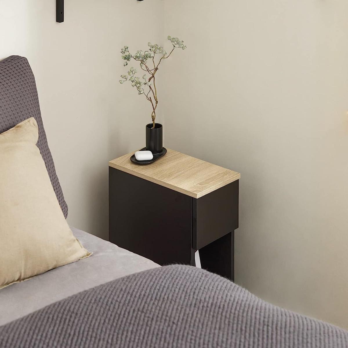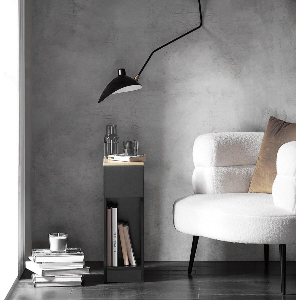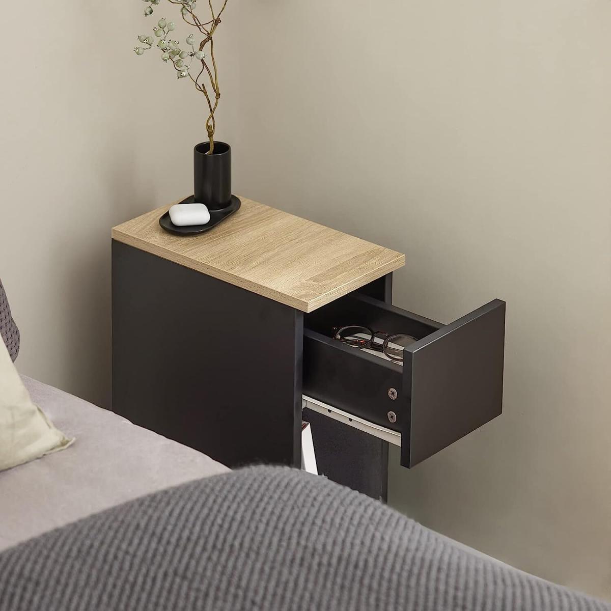 This side table nightstand creates a distinctive and modern atmosphere for your home. It is great to be used as a sofa side table or bedside table for you to get accessible to what you need. It offers ample storage space for books, magazines, remote controls, glasses and other small items, keeping your room tidy and organized. A slide-out drawer provides ample storage space for your personal items. The storage compartment beneath the drawer and the top shelf offer additional storage and display space for you. Practical and space-saving, it is a good addition to any room. 20cm in width, it is also ideal for any corner and gap. Elegant and simple design, it matches any home decor perfectly. Material Particle board, MDF.Dimensions W20 x D35 x H60cm. Weight 7.3kg. Load capacity 20kg. Item comes in a flat pack and requires self-assembly. Detailed instructions are supplied. The decorative elements are not included in the delivery.