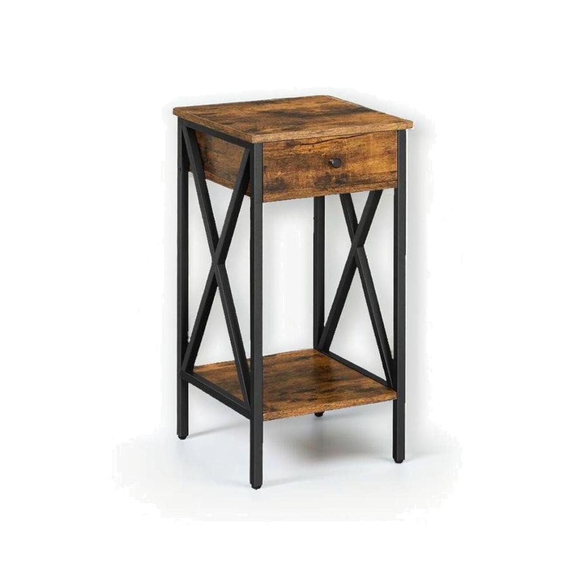 Sturdy Construction. The steel X framework not only adds a striking look but also pairs with particleboard to provide a stable, strong structure, supporting up to 40 kg. Measuring 35 x 35 x 70 cm, this side table fits perfectly in small spaces or beside a high bed, offering ample storage and an impressive industrial design