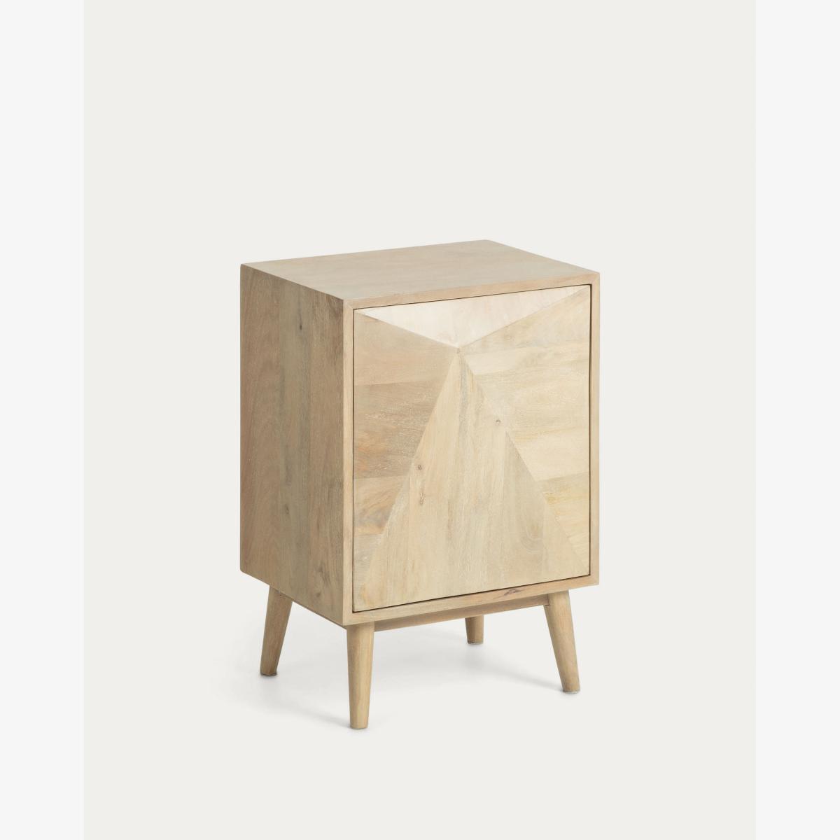 Bedside table in solid natural mango wood with carved door.