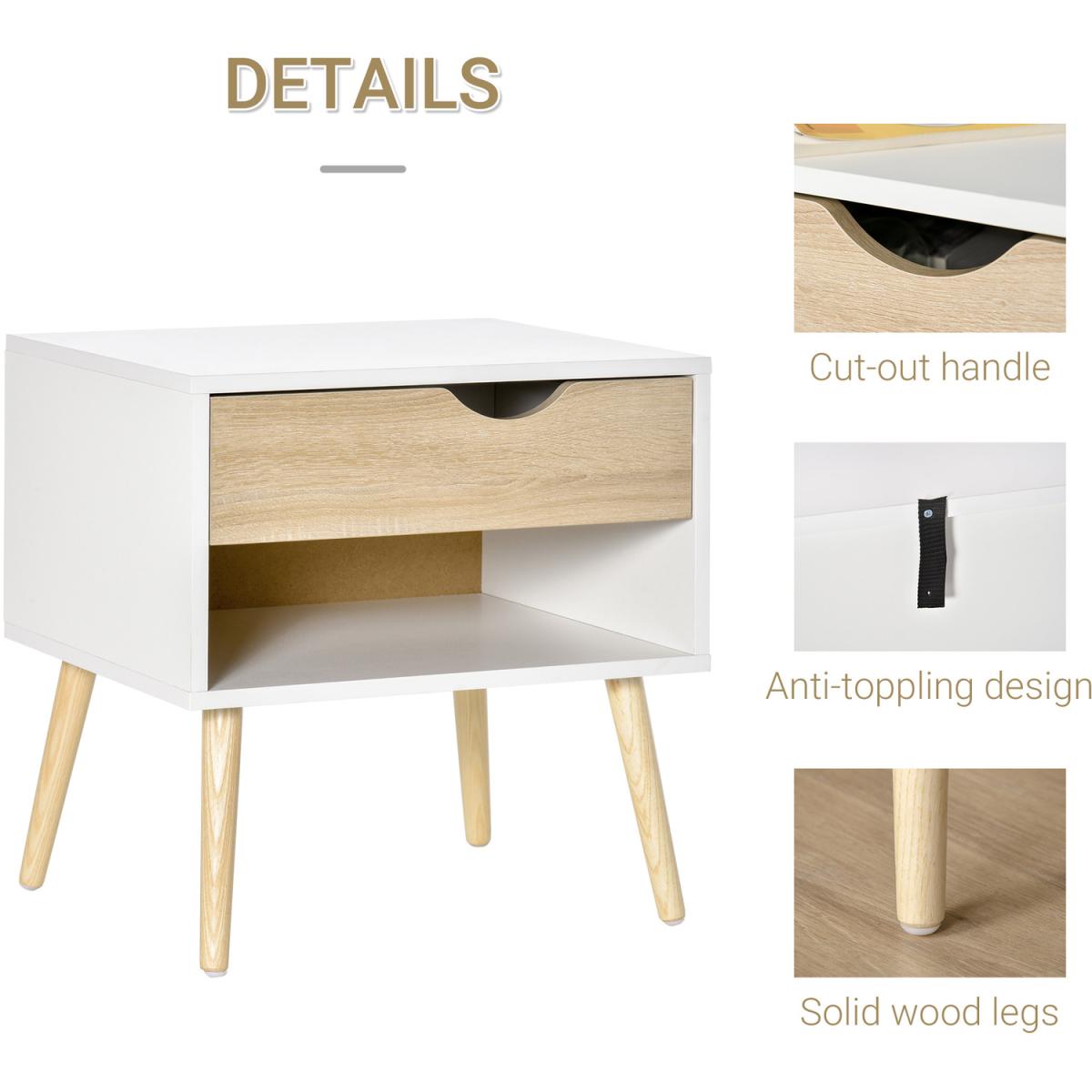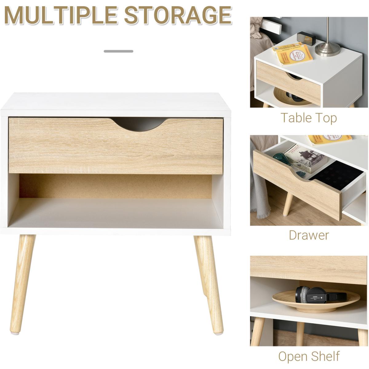 With its modern shape, this bedside table is sure to bring in a lux feel into your nightly routine. It's formed of a drawer and an open shelf, keeping what you need stored within easy reach. Using MDF board and particle board for the structure, it is solid and tough to withstand everyday use, and is coated with melamine for light protection against marks and stains. Four solid wood legs provide complete balance and stability to the unit. A piece to adore for years to come.