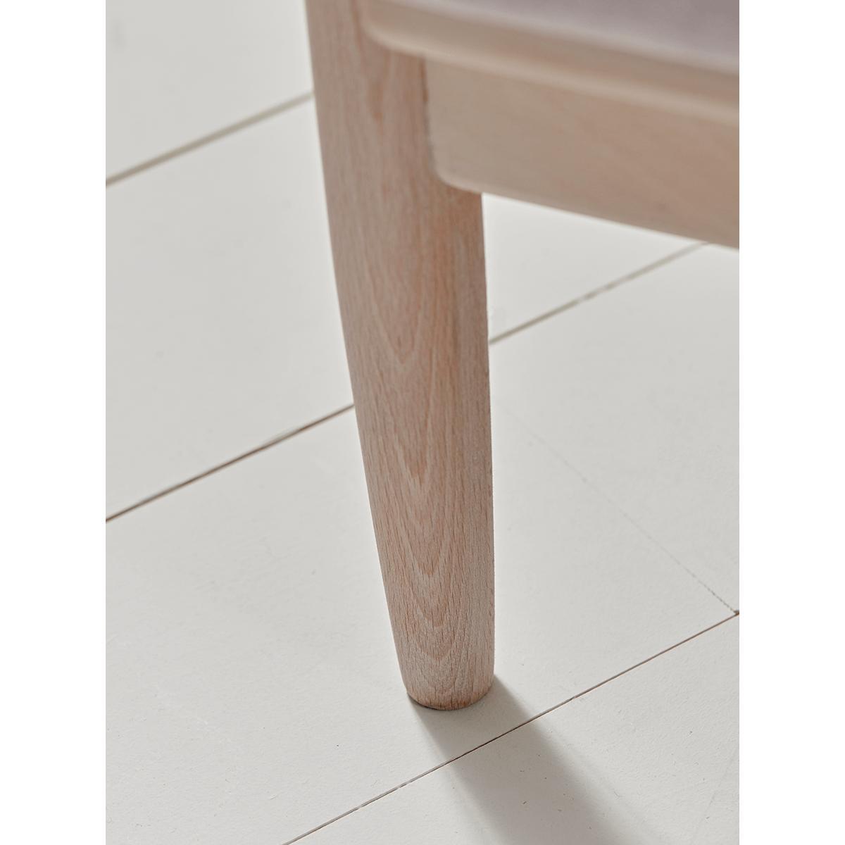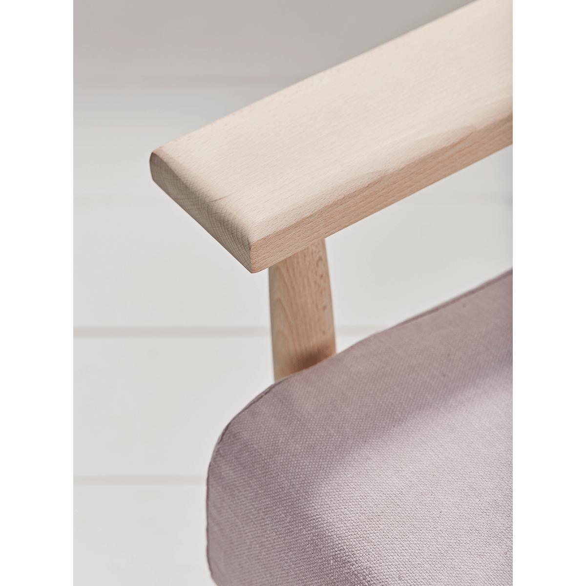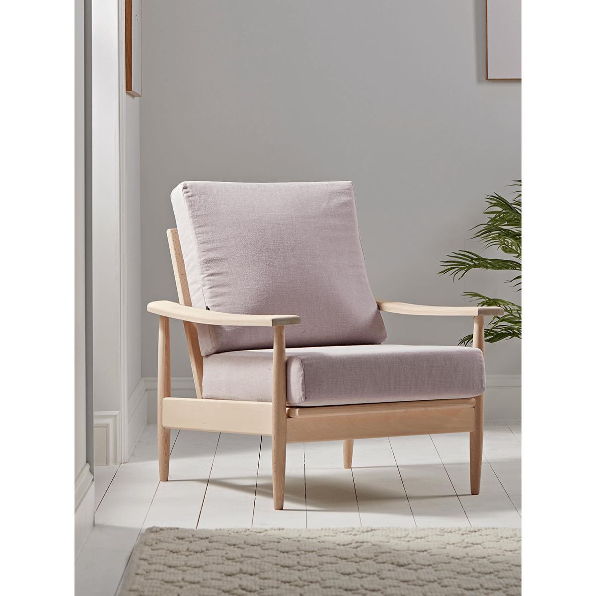 Our Spindleback Armchair will instantly update your space. Crafted from beech wood with an upholstered cushioned seat in a gentle toned blush, our armchair draws on mid-century principles with the considered construction of its frame. Vintage inspired design elements are here updated for the modern home - by a straight edge frame to the spindle back, a flat planed arm, and a pale toned natural wood finish. Also available in. Soft grey.