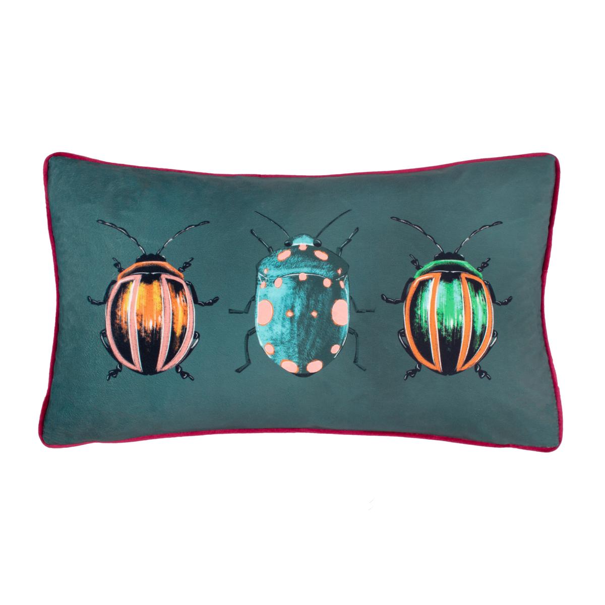The Beetalis Cushion showcases three colourful, iridescent beetles printed on plush velvet fabric. It features a plain reverse side and a contrasting piped edge, adding a subtle yet refined detail that elevates any room. Pair with the Beetalis duvet set for a complete look.