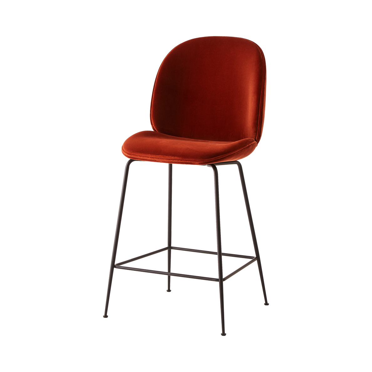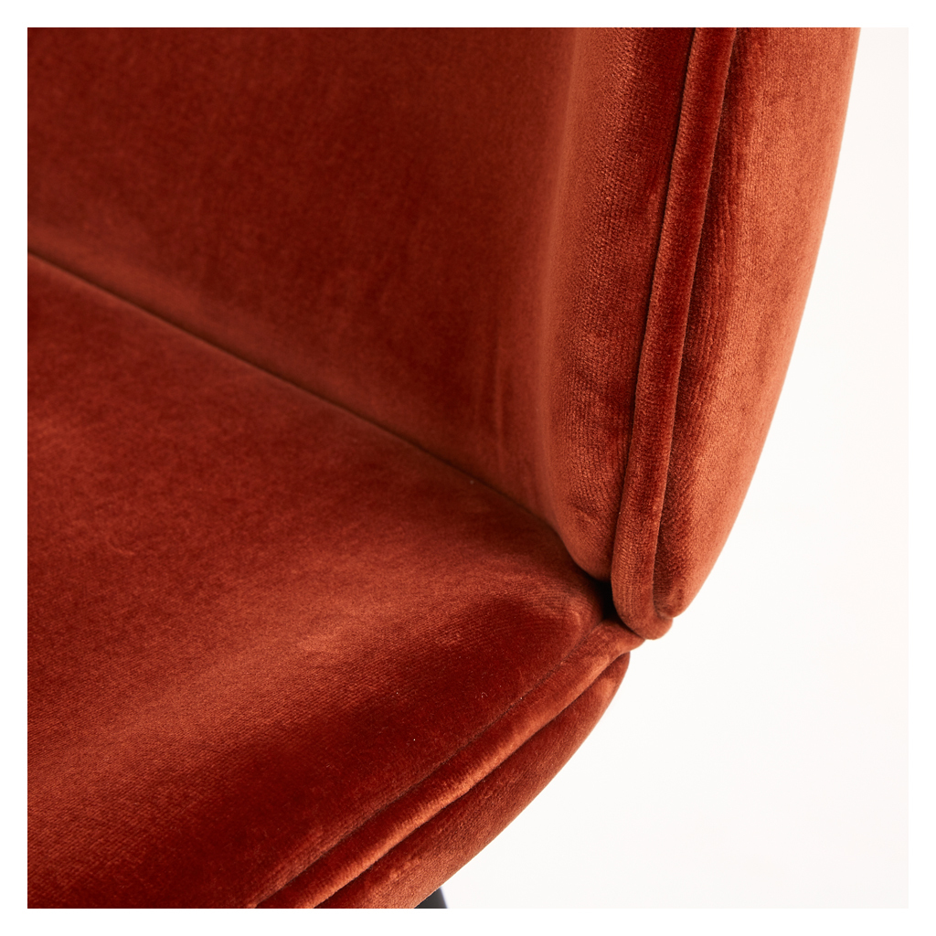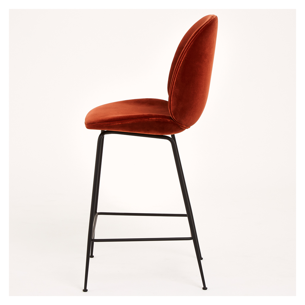 The creation of young design duo Enrico Fratesi and Stine Gam, the Beetle Bar Stool is inspired by the shape, shell and structure of the insect. Gam Fratesi found the anatomy of the beetle very interesting; the structure is made up of different plates separated by thin sutures, and it is this external shell that supports and protects the animal’s body. All these elements are perfectly linked and work in a fascinating way. The design of this counter chair reinterprets the characteristic elements of the beetle's body: rigid on the outside and soft within, while maintaining comfort and functionality, and is updated from the chair design to a new stool height which makes it perfect for breakfast bars. The seat and back are created using a laminated moulded veneer, upholstered in a luxurious rich velvet, while the non-stackable base with conical legs is crafted from steel with a black finish.