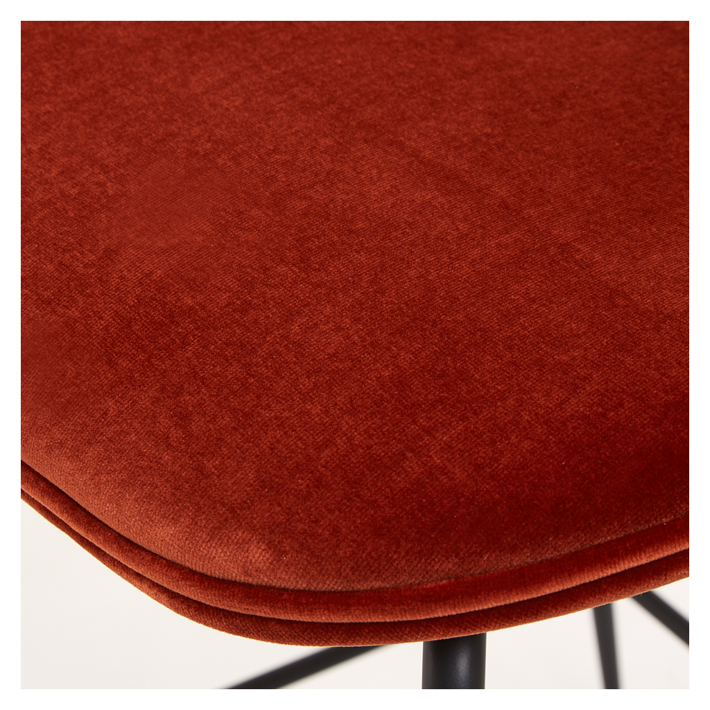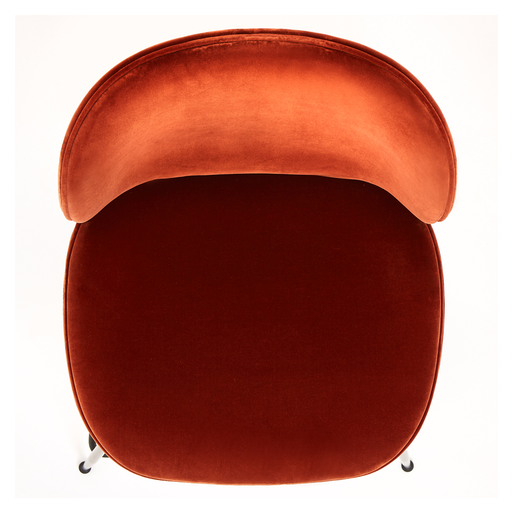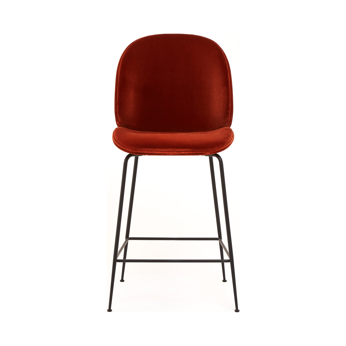 The creation of young design duo Enrico Fratesi and Stine Gam, the Beetle Bar Stool is inspired by the shape, shell and structure of the insect. Gam Fratesi found the anatomy of the beetle very interesting; the structure is made up of different plates separated by thin sutures, and it is this external shell that supports and protects the animal’s body. All these elements are perfectly linked and work in a fascinating way. The design of this counter chair reinterprets the characteristic elements of the beetle's body: rigid on the outside and soft within, while maintaining comfort and functionality, and is updated from the chair design to a new stool height which makes it perfect for breakfast bars. The seat and back are created using a laminated moulded veneer, upholstered in a luxurious rich velvet, while the non-stackable base with conical legs is crafted from steel with a black finish.