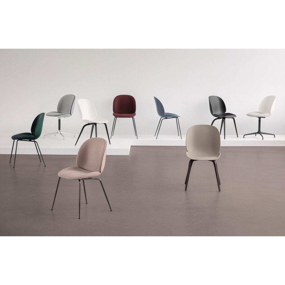 The Gamfratesi studio was created by Danish designer Stine Gam and Italian designer Enrico Fratesi. Their work combines different influences, from classic Italian Design to Scandinavian traditions. The Beetle chair is inspired by beetles. The seat and back are made from two padded shells with curved lines like the insect's shell. The elegant fine and tapered legs in brass plated steel look like a beetle's legs. All these elements are perfectly connected and crafted in a fluid manner. Super comfortable, the Beetle will be a home in different environments: around a dinner table, behind a desk, at home or in the workplace.