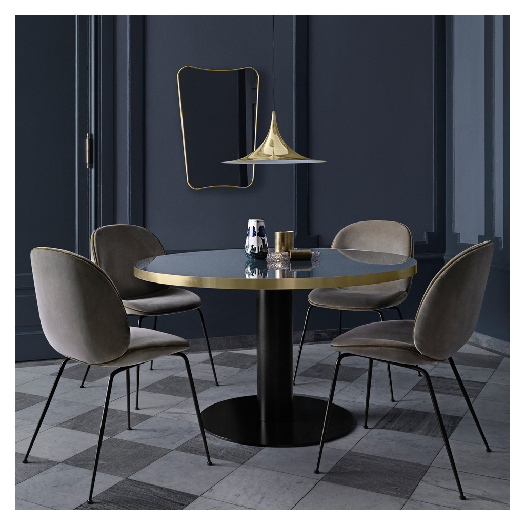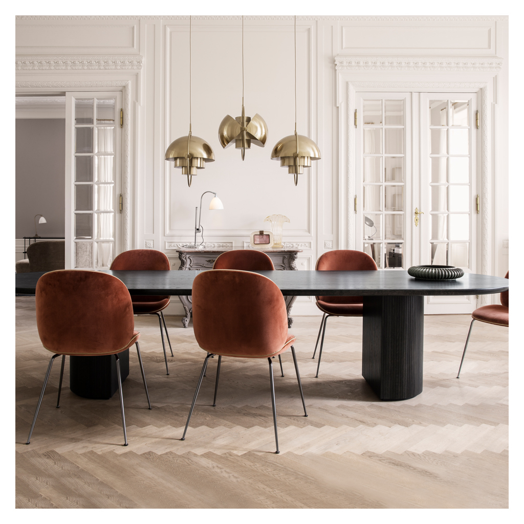 Designed in 2013 and first presented at Milan's annual Mindcraft exhibition, the Beetle Dining Chair is the creation of young design duo, Enrico Fratesi and Stine Gam, and is inspired by the shape, shell and structure of the eponymous insect. Gam Fratesi found the anatomy of the beetle captivating; the structure is composed of different plates separated by thin sutures, and it is this external shell that supports and protects the animal's body. All of these elements are perfectly linked and work together in a way that fascinated the designers. The design of the chair reinterprets the characteristic elements of the beetle's body: rigid on the outside and soft within, while maintaining optimum comfort and superior functionality. The seat and back of the Beetle Dining Chair are created using laminated moulded veneer. The chair is upholstered in a luxurious navy velvet, which is impeccably finished with velvet piping, while the non-stackable base features sleek black powder-coated steel legs that would accent any dining area. Available in a green, navy or terracotta velvet upholstery with either black powder-coated steel or polished brass legs.