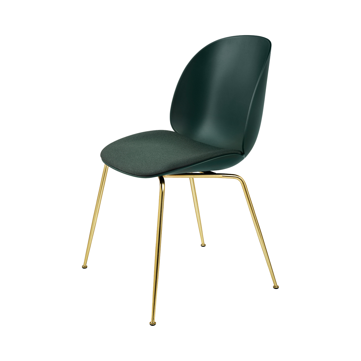 New for 2017, this upholstered seat edition of the Beetle Dining chair by young design duo Enrico Fratesi and Stine Gam is an update of the contemporary icon. The characterising feature of this exclusive edition is the cushioned seat section, upholstered in Danish textile specialist Kvadrat's premium Messenger fabric, in an assortment of colourways. The back and seat base of the Beetle chair is created using one piece of colour-matched curved plastic in an ergonomic shape ensuring comfort when sitting, while the sleek legs that make up the base are crafted from polished brass. Gam Fratesi found the anatomy of the beetle very interesting; the structure is made up of different plates separated by thin sutures, and it is this external shell that supports and protects the animal's body. Inspired by the shape, shell and structure of the eponymous insect, the design of the chair reinterprets these characteristics of the beetles' body: rigid on the outside with smooth curves, while maintaining comfort and functionality. This new upholstered seat edition of Gam. Fratesi's Beetle dining chair with polished brass legs offers Scandinavian simplicity and comfort in a subtle, clean-lined form. Also available with black chrome legs, and in upholstered and un-upholstered editions, with either black powder-coated steel or polished brass legs.